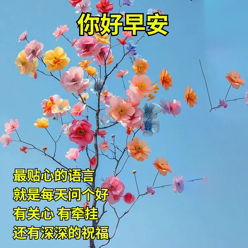 7,早晨,送你一份温馨的大礼,愿花儿代表祝愿,鸟儿代表平安,鱼儿代表快乐,风儿代表问候,云了代表缠绵,霞儿代表美满。