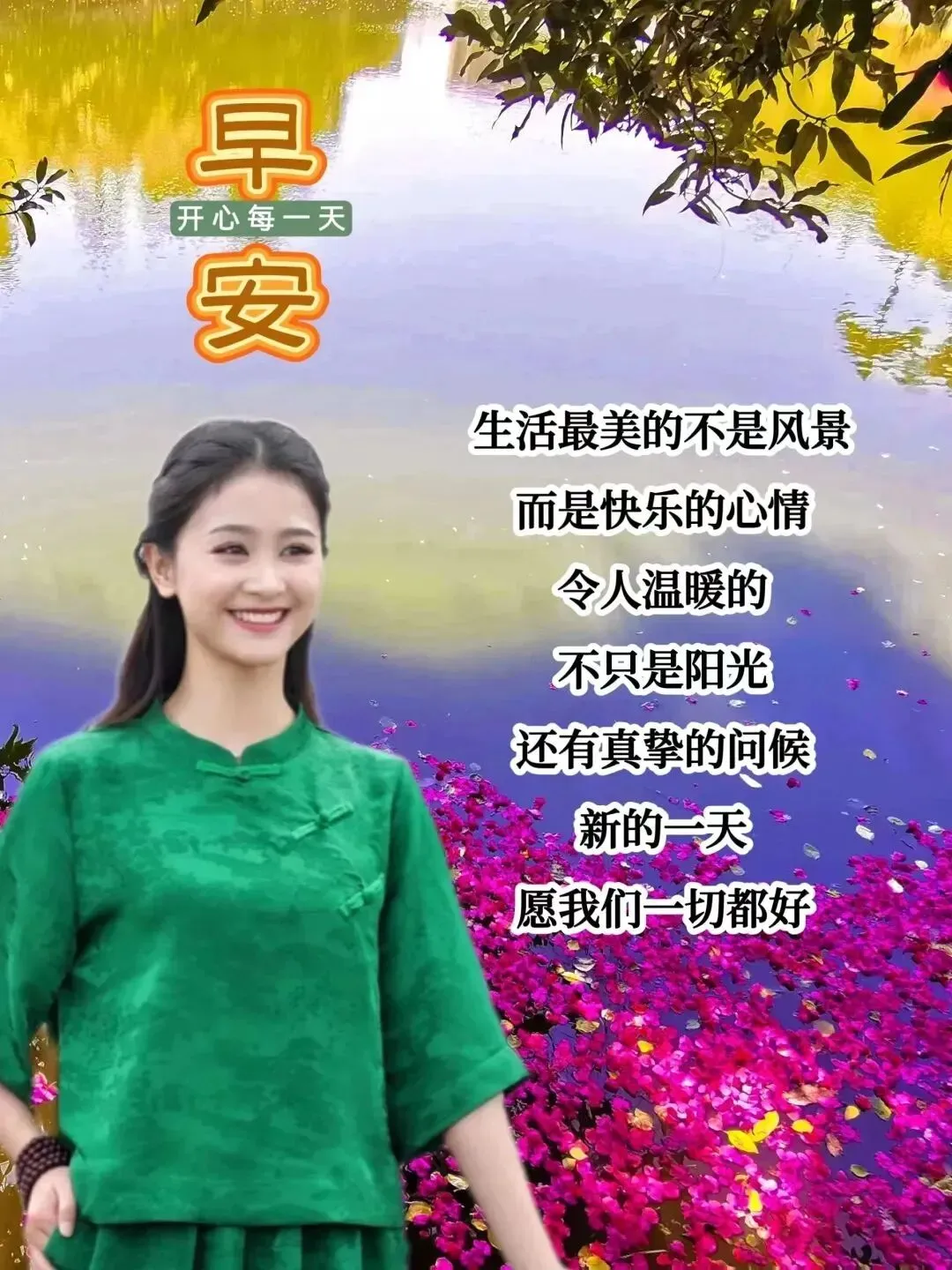 3,早安朋友,新的一天,请接受我的祝福。恭喜发财,财源滚滚来;吉祥如意,幸福安康在。愿你心想事成,健康长寿,幸福永远伴随!