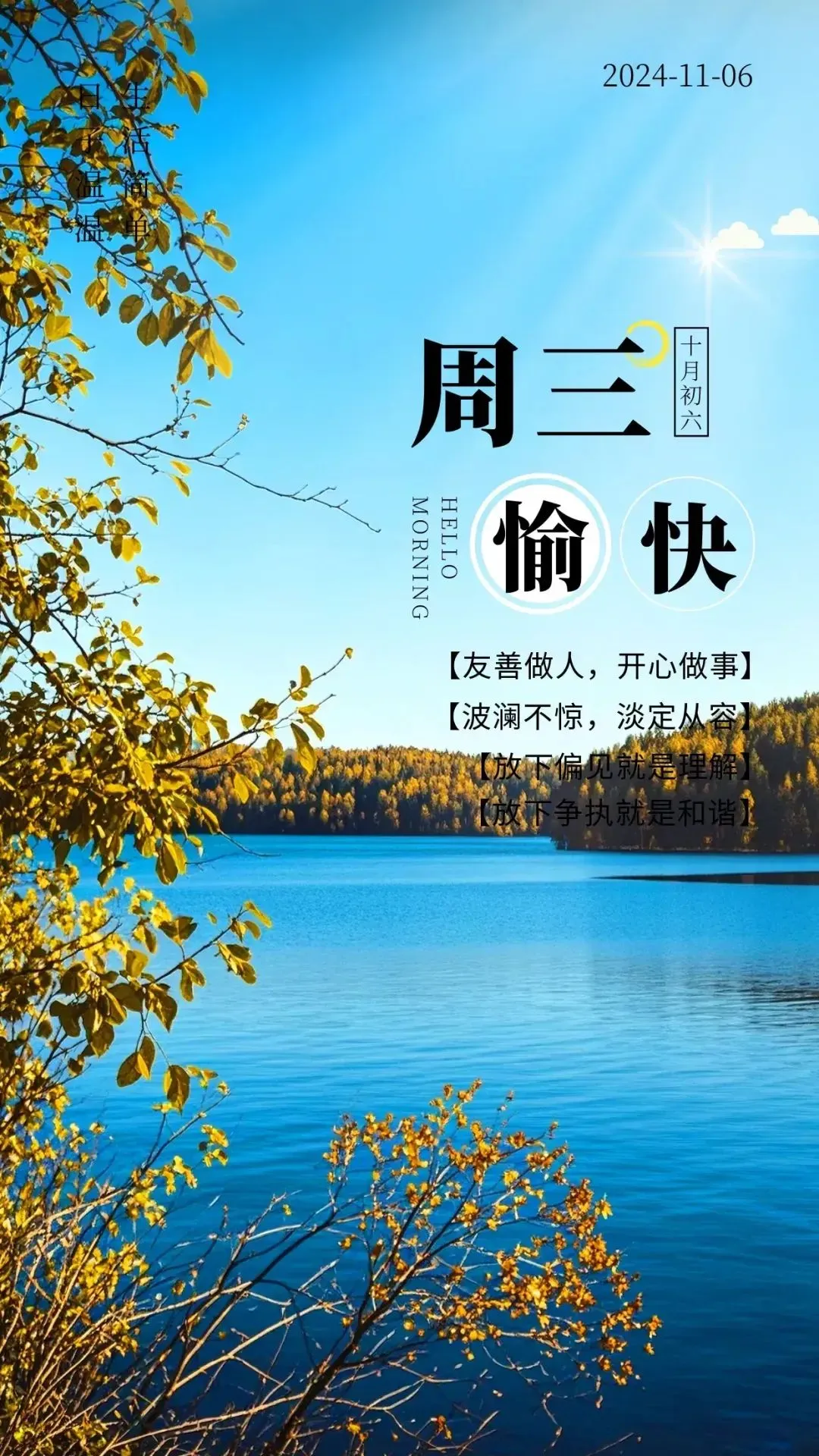 10,人生天地宽,情系亲友间,合掌问平安!感恩我们有缘,感恩我们相遇,感恩时光不老,感恩真情常在!一段时光,不在长短,贵在开心;一份情谊,不在远近,贵在知心;一句言语,不在多少,贵在暖心。早安!