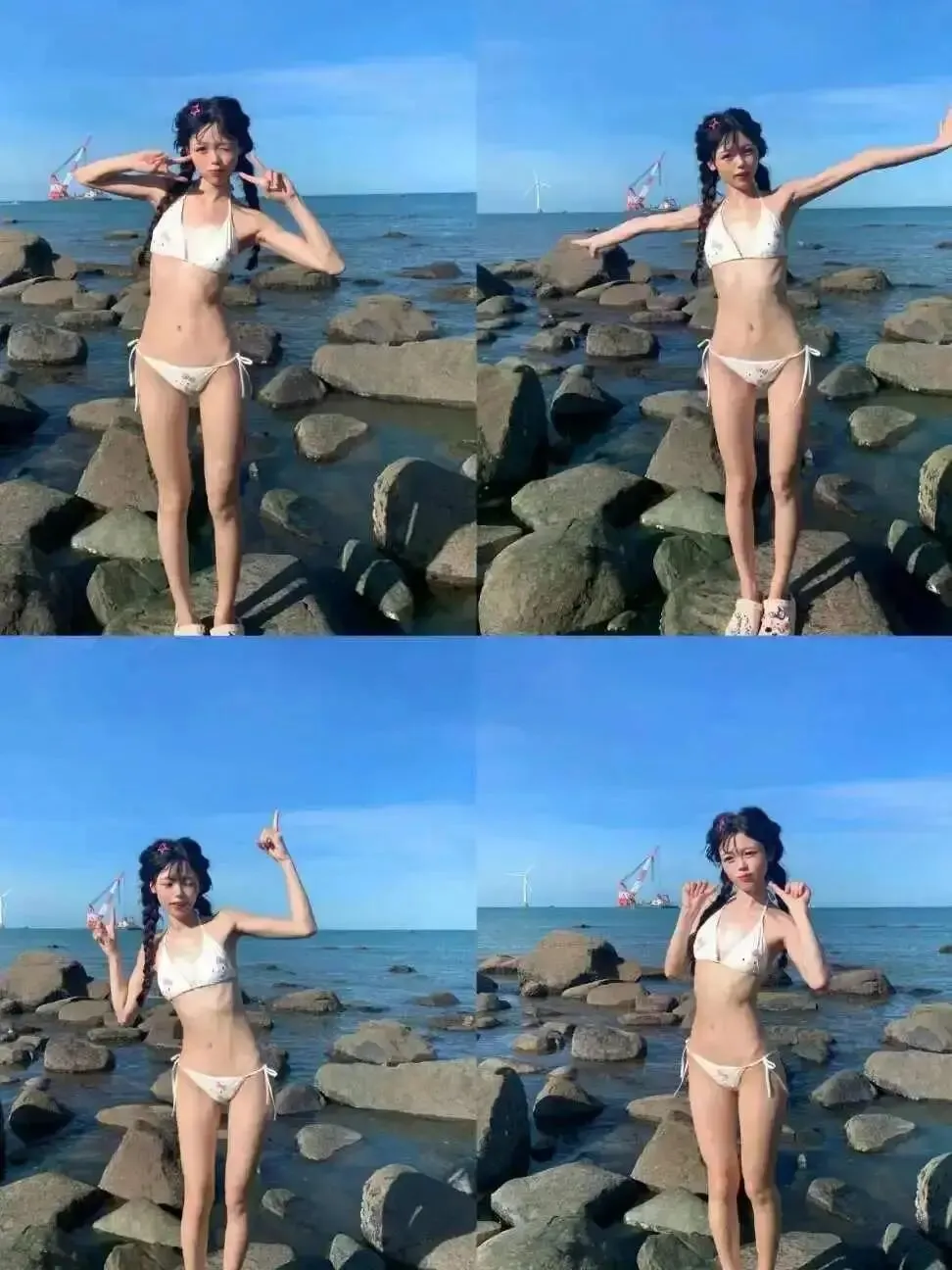 白色泳衣拍照5个姿势,海边礁石这样拍,清爽甜美又超出片