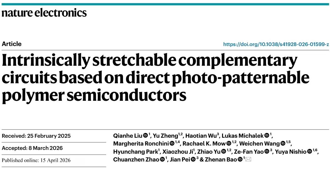 Liu, Q., Zheng, Y., Wu, H. et al. Intrinsically stretchable complementary circuits based on direct photo-patternable polymer semiconductors. Nat Electron (2026). https://doi.org/10.1038/s41928-026-01599-z