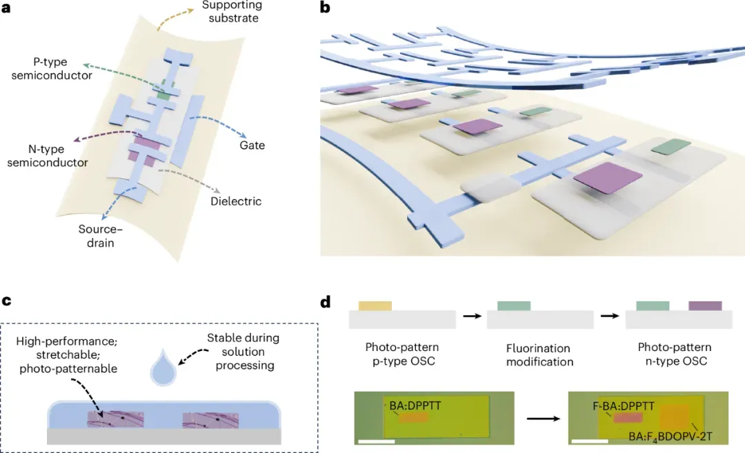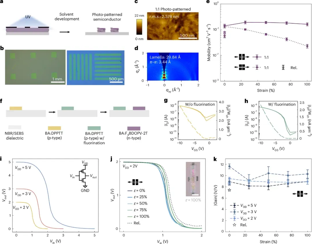 斯坦福大学鲍哲南院士团队报道了一种全溶液加工、无需转移工艺的本征可拉伸有机互补电路。该工作首先开发了一种高性能且可光图案化的N型聚合物半导体,通过将高迁移率的四氟代苯并二呋喃二酮基寡聚对苯乙烯与联噻吩(F4BDOPV-2T)共价嵌入致密的紫外光交联弹性体基质(聚丁二烯,BA)中,制备了在100%应变下电子迁移率仍高达0.28 cm2 V−1 s−1的全拉伸晶体管。同时,作者利用共价氟化功能化策略保护P型半导体层,实现了在已存在的P型层上连续、直接光图案化N型半导体而不会引发电学性能退化。