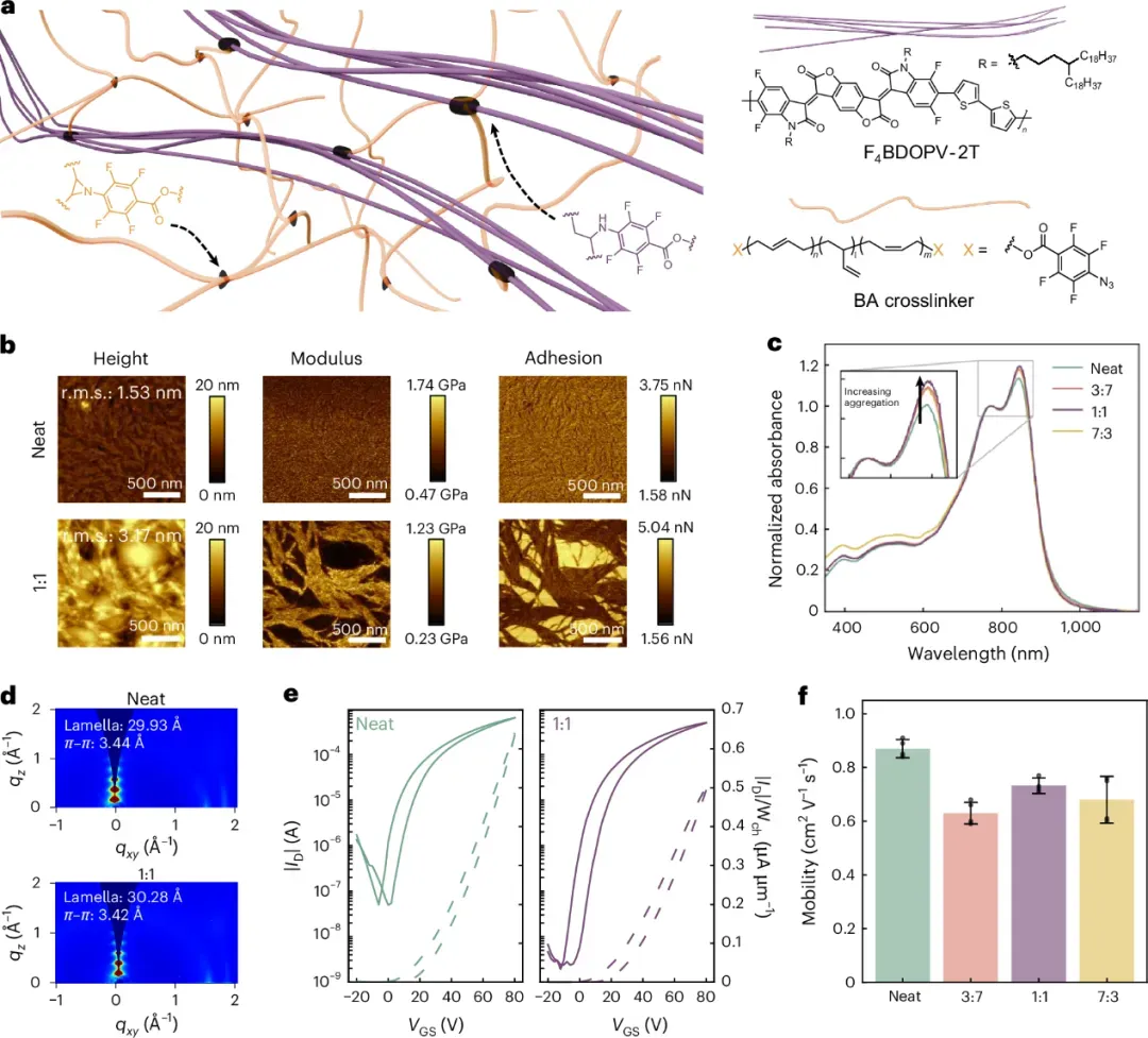 图 2 系统表征了N型半导体F4BDOPV-2T与BA弹性体共混交联薄膜的形貌与电学性能。图a通过示意图描绘了F4BDOPV-2T纳米纤维嵌入BA弹性体基质的微观结构。图b利用原子力显微镜(AFM)纳米力学成像,对比了纯F4BDOPV-2T薄膜与热交联BA:F4BDOPV-2T 1:1薄膜的DMT模量与粘附力分布,证实了相分离导致的刚性纤维网络与柔软基质的形成。图c的紫外-可见吸收光谱显示,交联薄膜(特别是1:1比例)在844 nm处的0-0跃迁峰强度相对增加,表明嵌入弹性体后半导体链间聚集作用增强。