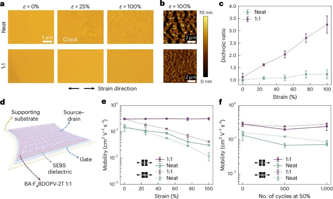 图 3 聚焦于全可拉伸N型半导体薄膜及晶体管的力学与电学性能测试。图a通过光学显微镜观察发现,支撑在PDMS基底上的纯F4BDOPV-2T薄膜在25%应变即出现裂纹,而BA:F4BDOPV-2T 1:1薄膜在100%应变下仍无可见裂纹。图b的AFM高度图进一步确认,经历100%应变后,纯膜出现1-2微米宽的裂纹导致薄膜不连续,而1:1交联膜仍保持纤维网络的连通性。图c的偏振光谱二色性比测试表明,1:1薄膜随应变增加至100%呈现近乎线性的二色性比增长,说明应变能通过聚合物链沿拉伸方向排列而耗散;相反纯膜因裂纹产生而几乎无链排列。