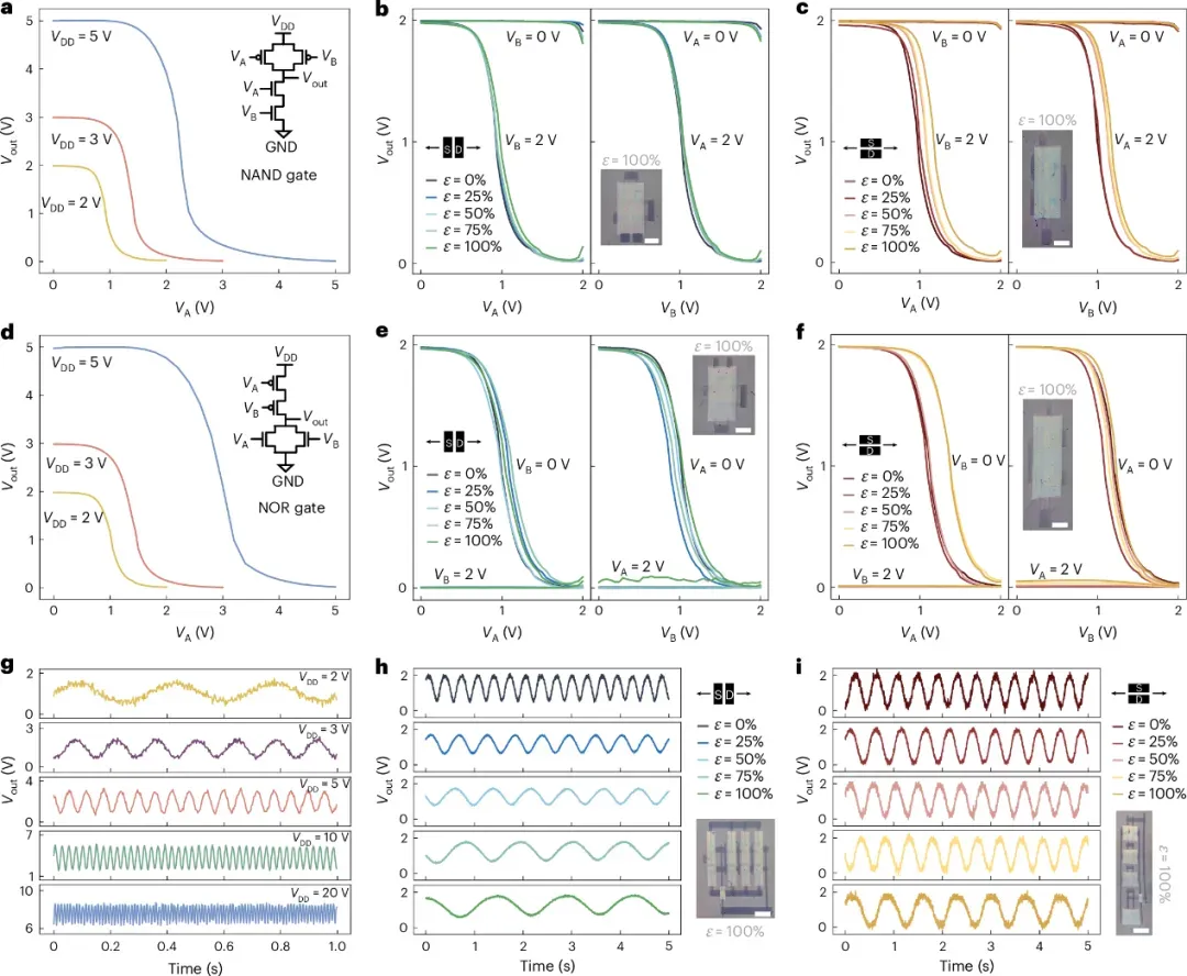 图d展示了或非门在0%应变及不同供电电压下的传输特性。图e和f则分别验证了或非门在平行与垂直应变方向下、于2 V电压及100%应变范围内的鲁棒性。图g展示了由三个反相器级联构成的环形振荡器在0%应变下、不同供电电压时的输出振荡信号。图h和i进一步显示了该振荡器在2 V供电时,分别沿平行与垂直方向承受0%至100%应变仍能产生稳定的振荡波形,插图为拉伸至100%应变时的器件照片,比例尺为2毫米。这些结果有力地证明了该技术在构建复杂、高密度本征可拉伸集成电路方面的巨大潜力,标志着皮肤电子学领域迈出了关键一步。
