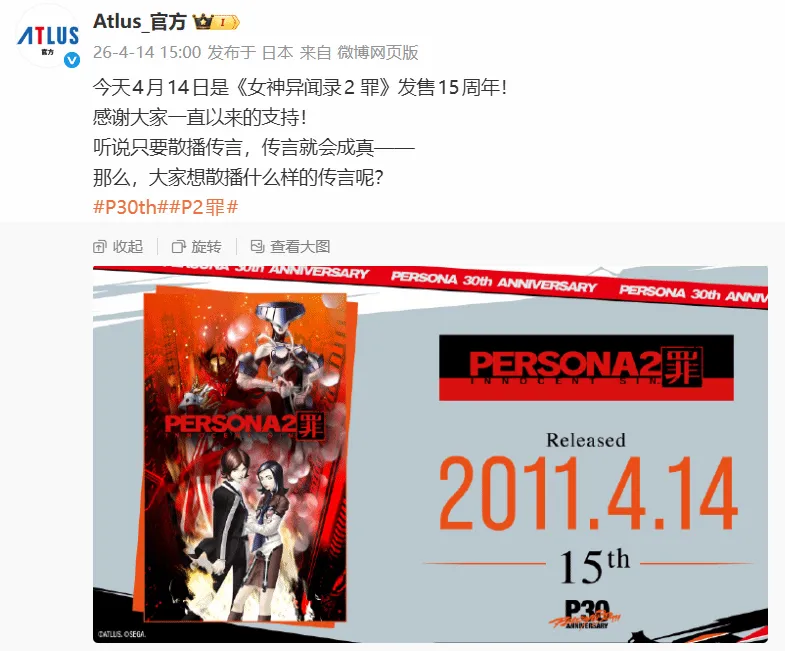 甚至就连Atlus官方都在微博上暗示,称“听说只要散播传言,传言就会成真”,同时配上了《女神异闻录2:罪》的图片,暗示将要推出重置。