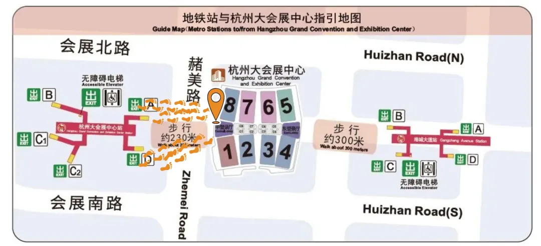 地铁:1号线杭州萧山国际机场站——杭州大会展中心站A/D口下,再走300米到中登录厅入口进场