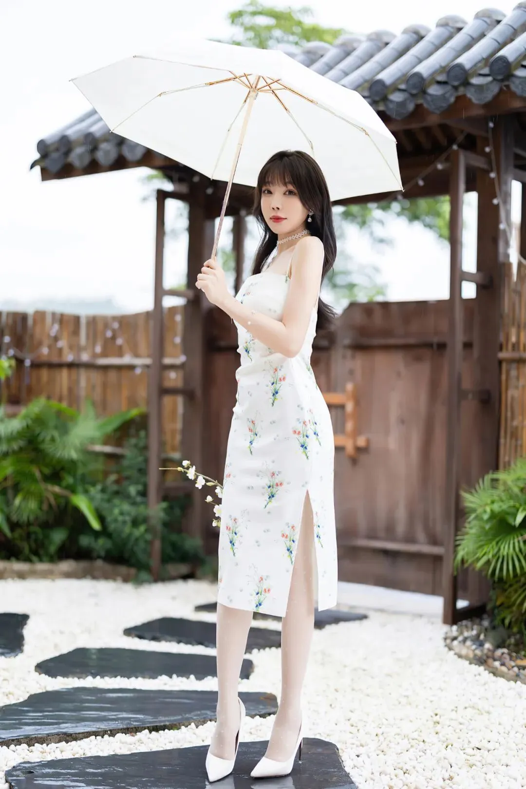 一身白色印花连衣裙,搭配白色波点丝袜和白色高跟鞋,性感中不是清纯感,又纯又欲。▼