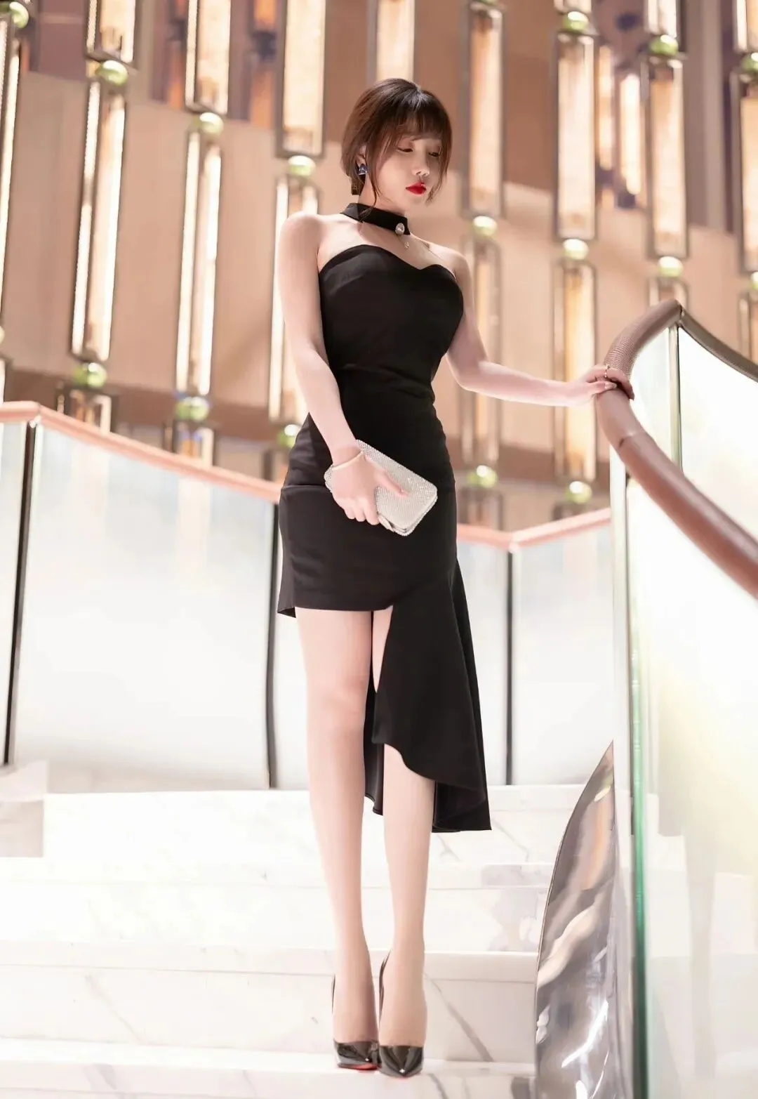 黑色抹胸不规则设计连衣裙,搭配肉色丝袜和黑色红底高跟鞋,尤其是芝芝的小翘臀,圆润挺翘,这谁能顶得住?▼