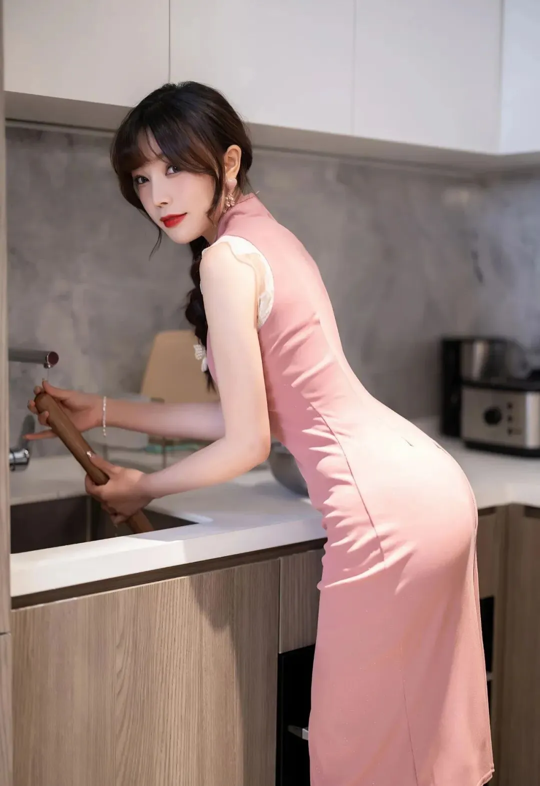 肉粉色连衣裙,搭配黑丝,这身材曲线真的是太美了,看了芝芝的身材,才知道什么叫前凸后翘。▼