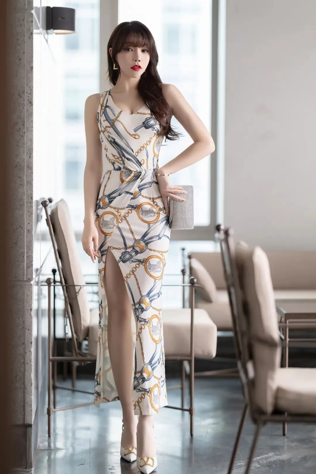 高开衩连衣裙,裙衩一直开到了大腿根,露出芝芝一双迷人的大长腿,性感至极。