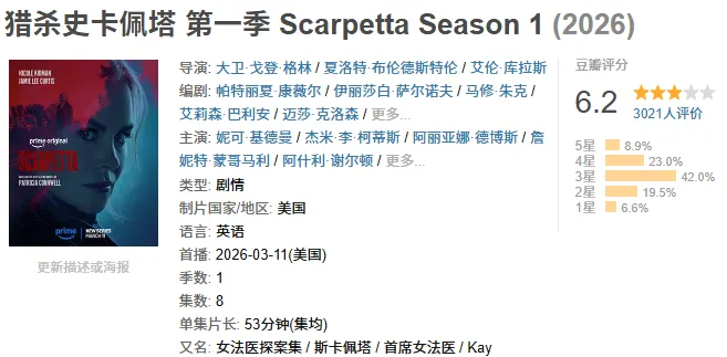这部剧叫《首席女法医》,原版叫Scarpetta,改编自全球销量破1.2亿册的法医悬疑小说系列。