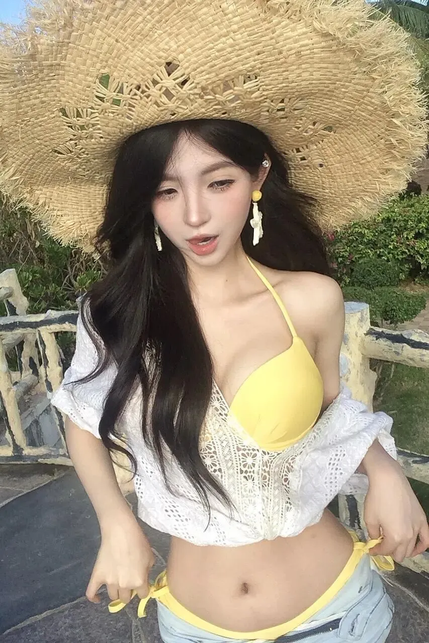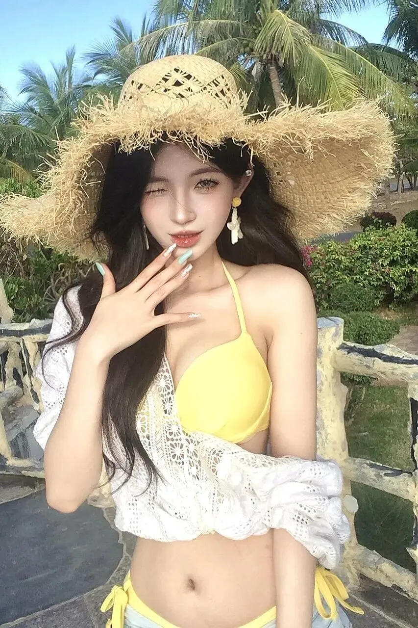 很多人去海边拍照的时候,最怕的不是不知道怎么拍角度的问题,而是手都不知道放哪里好,在表情上用力了就会显得生硬一点,近景一拍摄的话又很容易被觉得刻意。这组照片其实就很适合普通女生直接照着拍,热带树影、草编大帽子、浅黄色泳装自带轻松明亮的度假感。