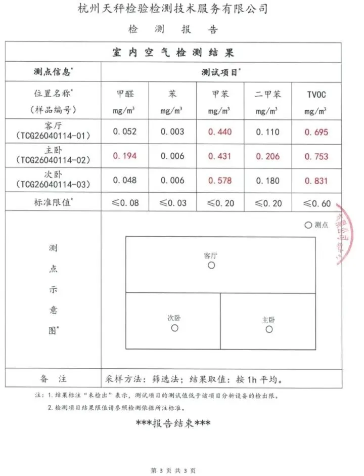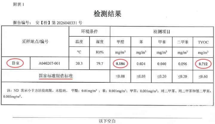 当晚我花了280元购买‘杭州允峰环保科技有限公司’的‘甲醛检测服务’,因为房子小一室一厅就检测卧室一个点第二天允峰上门做检测。4月3日,杭州允峰的‘室内空气质量’检测报告显示,卧室甲醛((mg/m³))为0.184,是国家标准限值(≤0.08)的2.3倍,TVOC为0.712,超出国家标准限值(≤0.60)检测公司的人私下告诉我,这样的房子,在自然通风环境下至少一年内都无法入住。