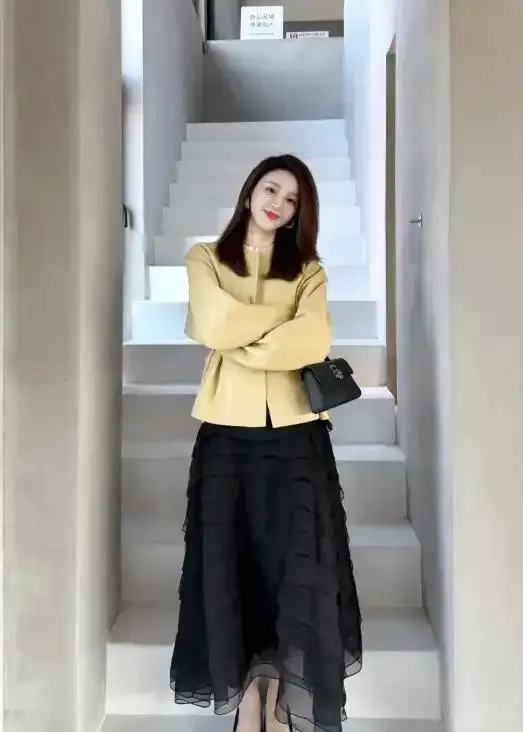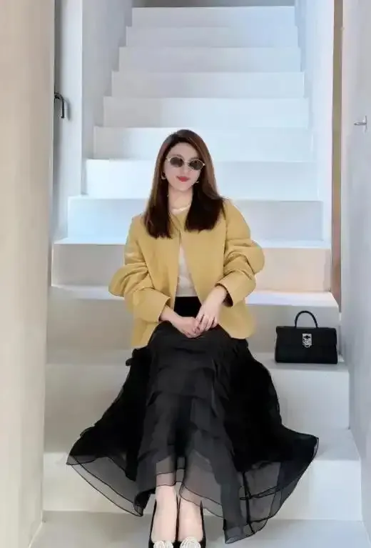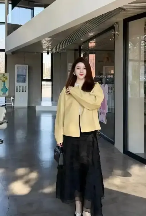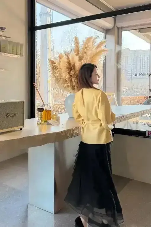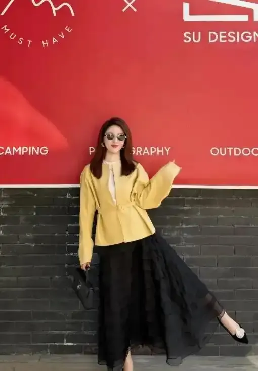 第一眼其实不是被裙子吸住的,我先皱了一下眉:这么浅的奶油黄,配一条大面积黑纱裙,按我以前的经验,特别容易穿成“上半身温柔,下半身发沉”的割裂感。可她没有。后来我才意识到,关键根本不在颜色,在开口。领口开了一点,外套门襟也没有死死合上,那条浅色内搭像一条细细的纵线,把黄和黑悄悄串起来了🔍