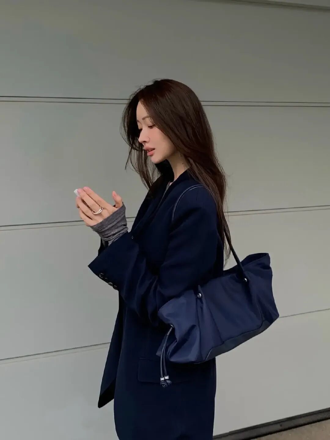 这次车贞媛以Oversized深色西装外套搭配合身直筒裤,内搭灰色上衣,整体看来是非常干净的深色调造型,这种“看起来很简单顺眼”的穿搭方式,正是她被封为“私服女神”的原因。