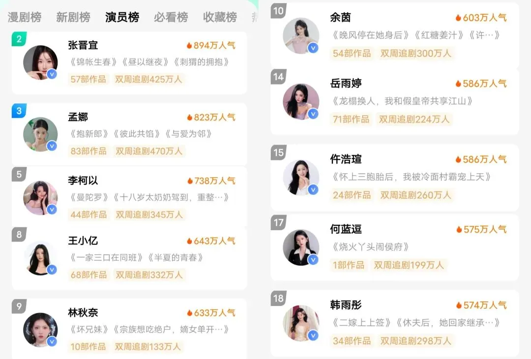 随着近期多部头部短剧上新,感觉大盘有热起来的趋势,🍎的演员人气榜也大变样了。