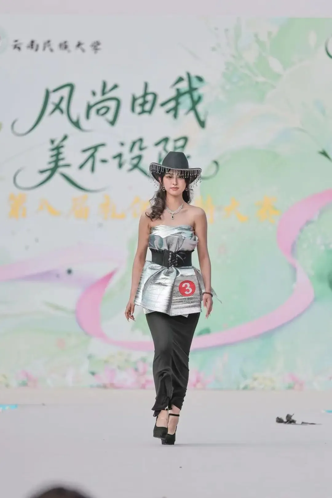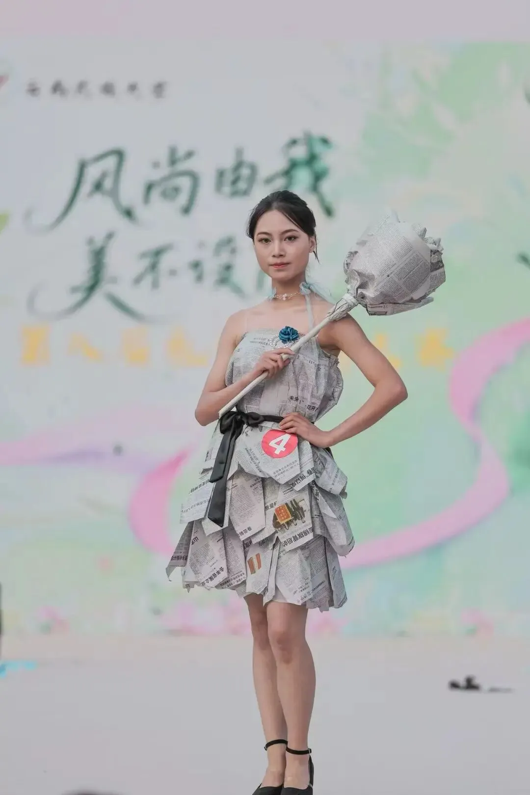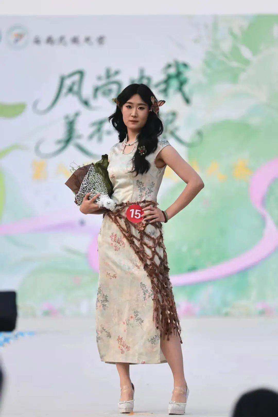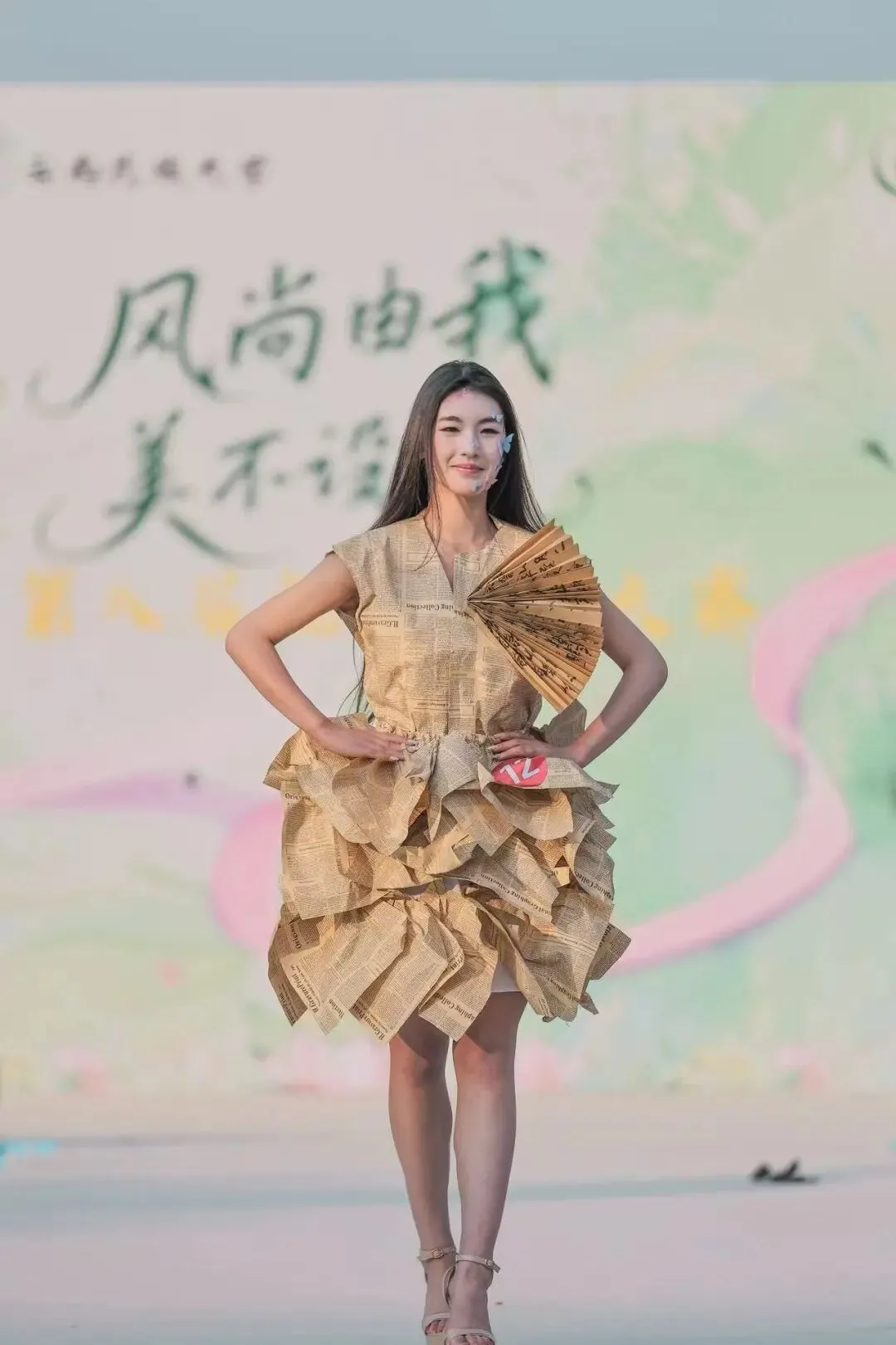 “自然新生・环保秀”中,选手身着再生材质与自然元素打造的创意服饰,传递绿色低碳理念,尽显青春与环保的碰撞融合。