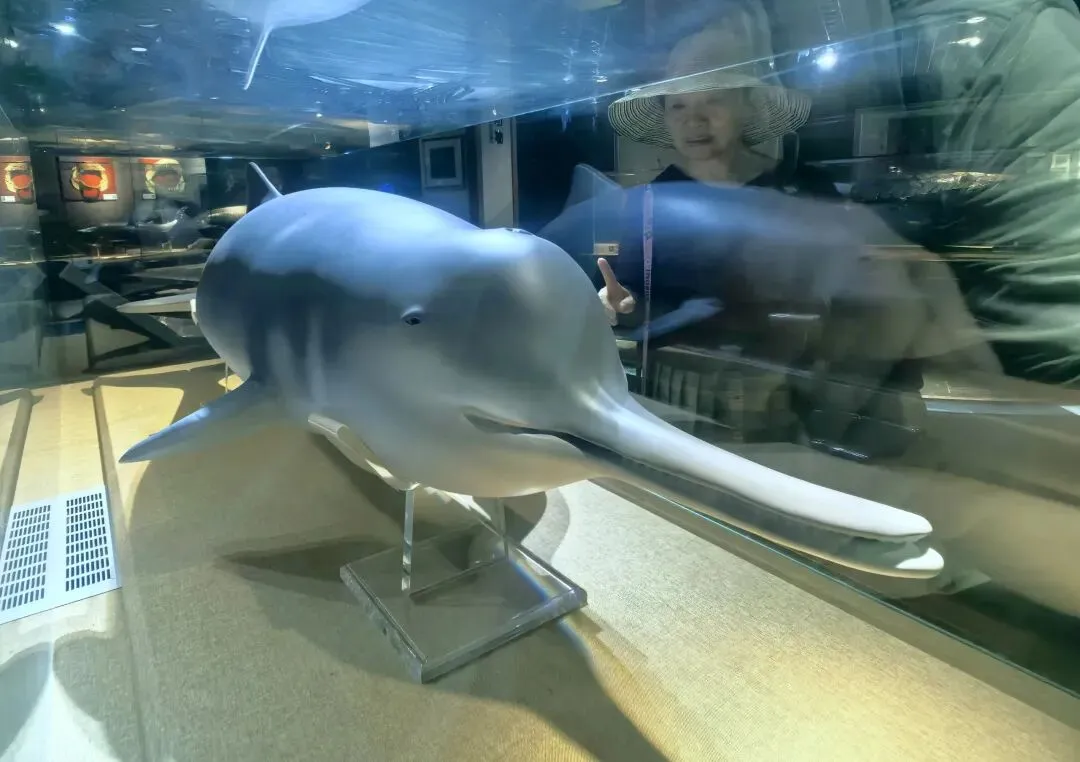 一旁的长江江豚标本,带着标志性的“微笑”,温柔又治愈,也时刻提醒着每一位参观者,守护长江生态、留住这些水生精灵,刻不容缓。