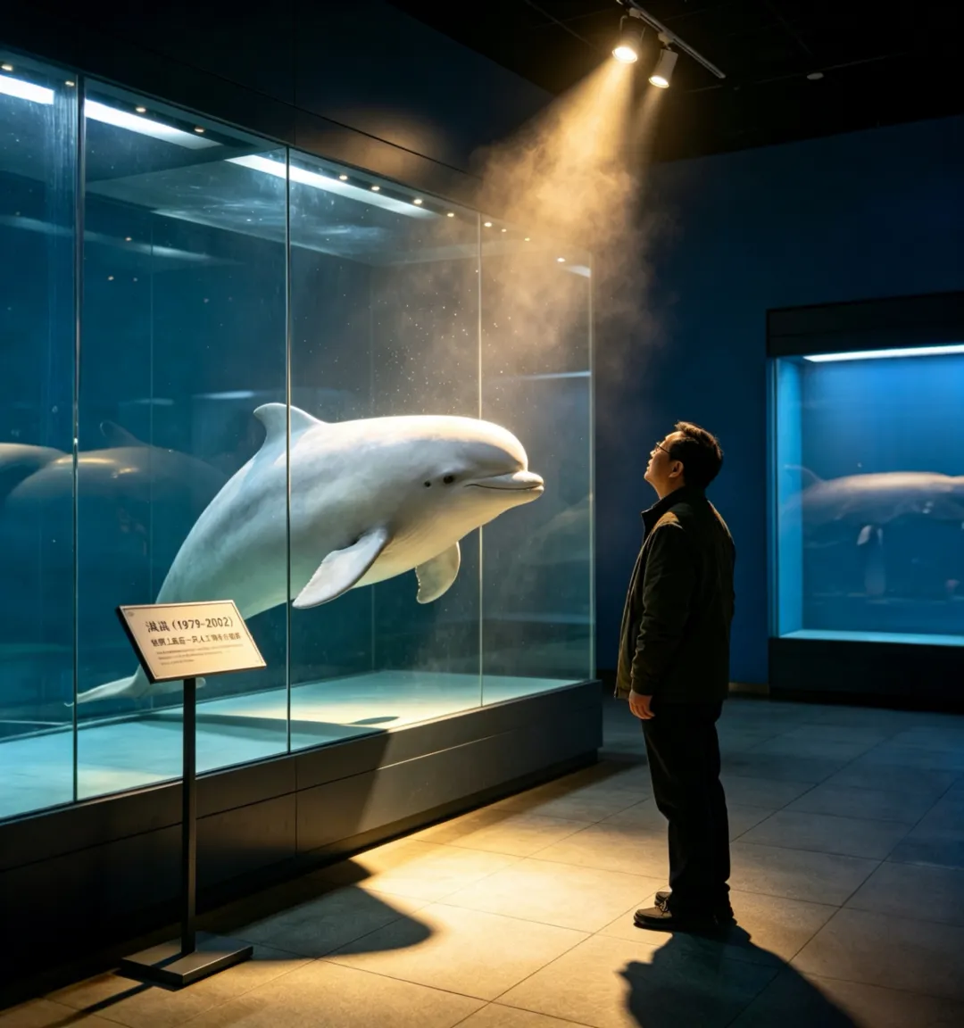 如今只剩高仿真模型与珍贵影像, Functional extinction的科普文字,满是惋惜。作为全球唯一一头长期被人类饲养的白鱀豚,“淇淇”曾是长江女神的象征,如今只能通过高仿真复原模型和珍贵影像,回望它的身影。看着展板上白鱀豚曾经的生活画面,再读到其功能性灭绝的科普知识,心中满是惋惜。