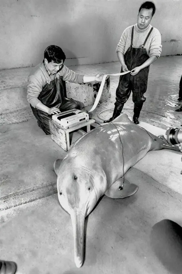 2002年6月20日,中国科学院水生生物研究所(武汉)白鱀豚馆的科研人员,正在为年迈的淇淇进行全面的身体检查。(摄影石一)
