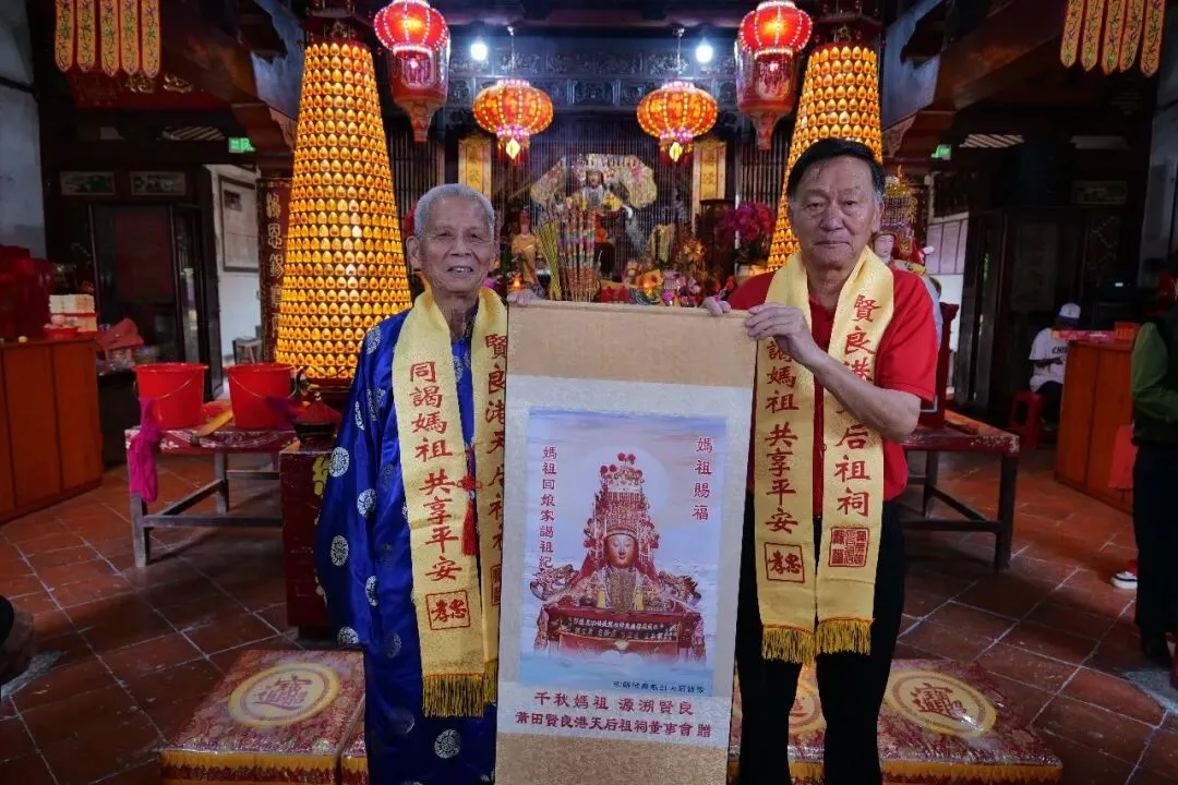 下午3时30分许,莆田秀屿区笏石大坵三妃宫进香团抵达贤良港天后祖祠。祖祠董事会董事长林自弟对进香团的到来表示热烈欢迎,并陪同进香团向妈祖行庄严的三献礼仪式。