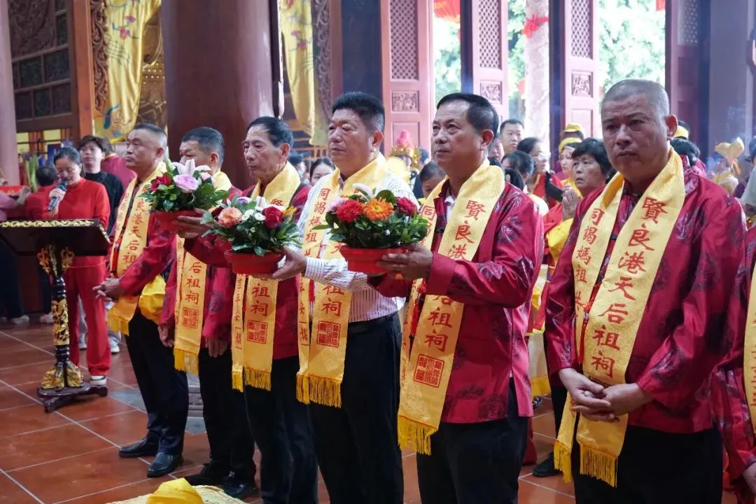 上午7时45分许,莆田湄洲忠门镇琼山丽山宫进香团抵达贤良港天后祖祠。祖祠董事会董事长林自弟对进香团的到来表示热烈欢迎,并陪同进香团向妈祖行庄严的三献礼仪式。