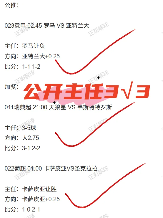 正哥对各大场次研究调研非常细致,需要根据长周期的数据变动来判断比赛走势,才能得出严谨的结论!信心赛事一般会提前出炉,早场赛事一般在赛前2-3小时前更新至大本营,而晚场赛事将会18点左右依次更新!部分临场会更晚些时候上架!兄弟们敬请留意!不要错过!