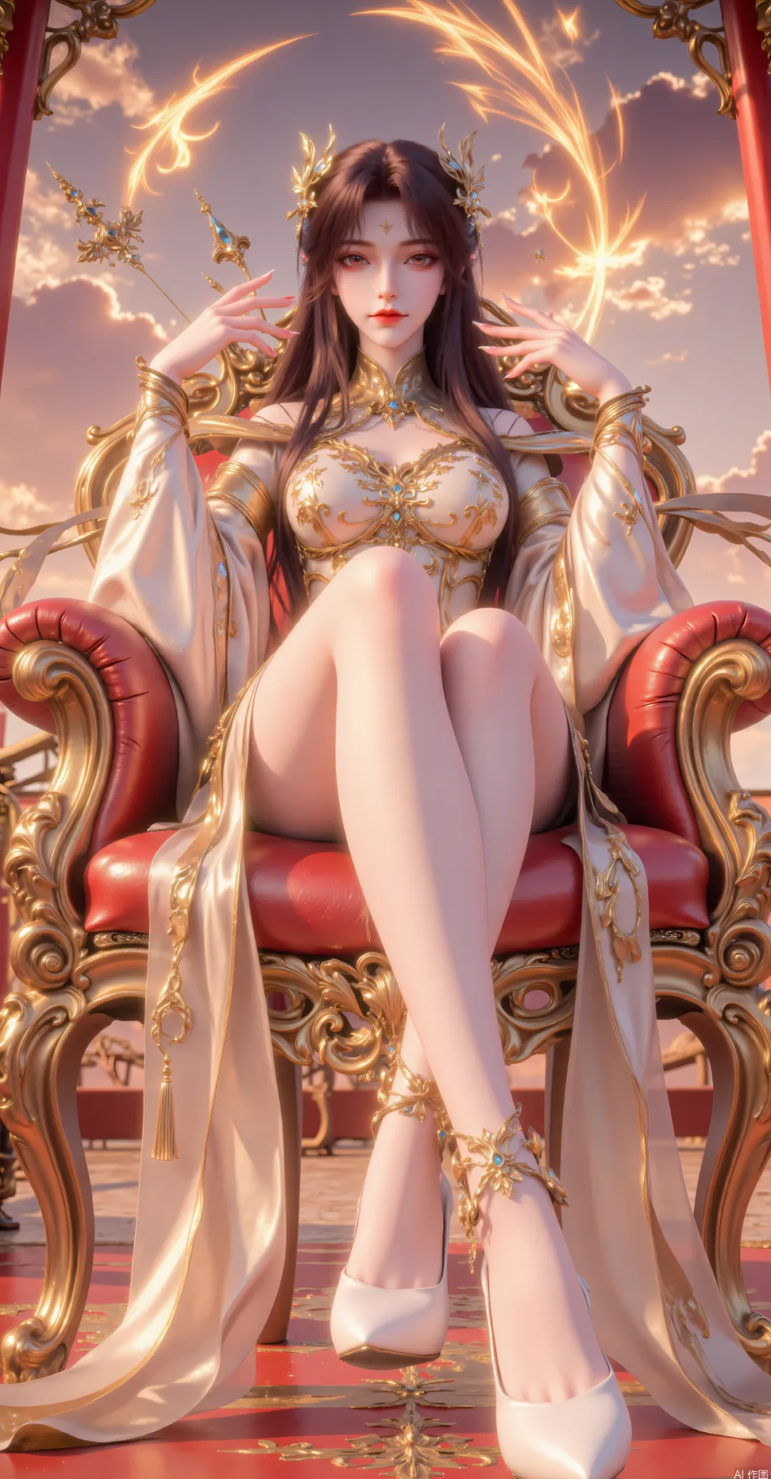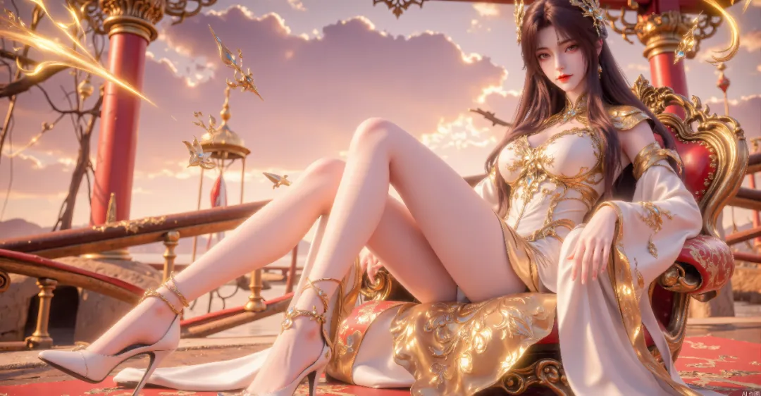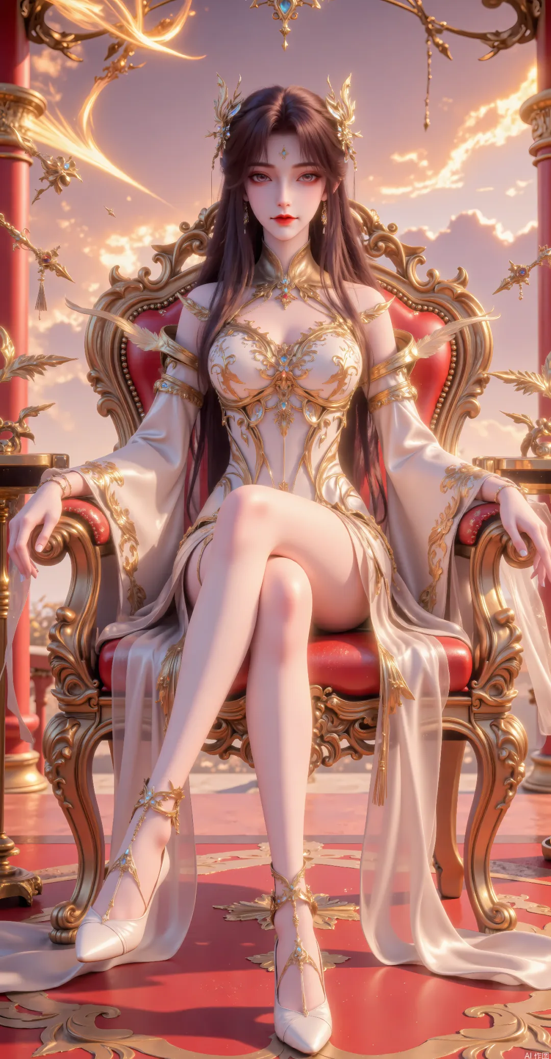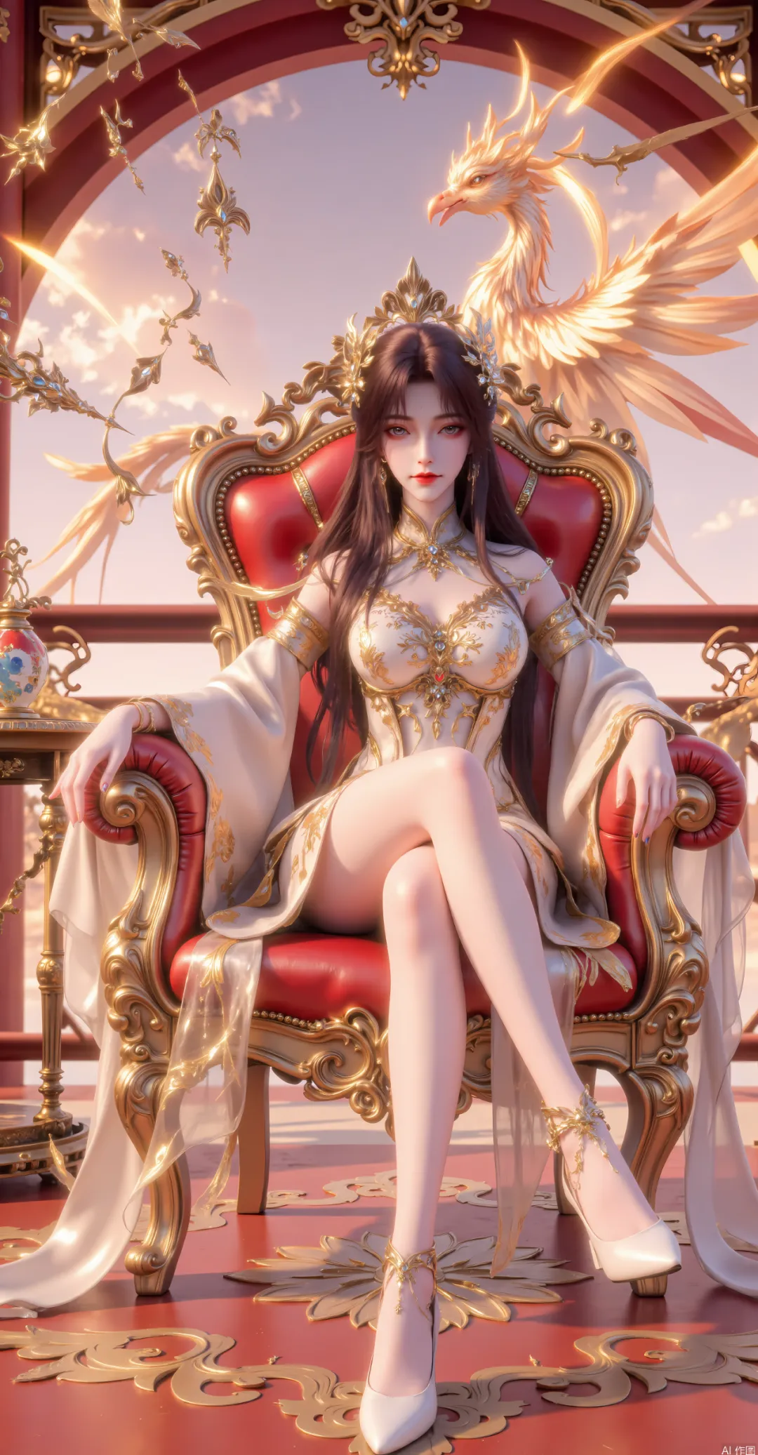 她端坐于一张极度华丽的红金配色高背龙椅之上,整体呈现出一种不可侵犯的极致高贵与威严。她拥有一头柔顺的深棕色长发,头戴闪耀的金色枝叶状流苏发饰;面容精致冷艳,眼眸深邃,朱红的唇色与白皙透亮的肌肤形成鲜明对比,神情从容中透着高高在上的疏离感。