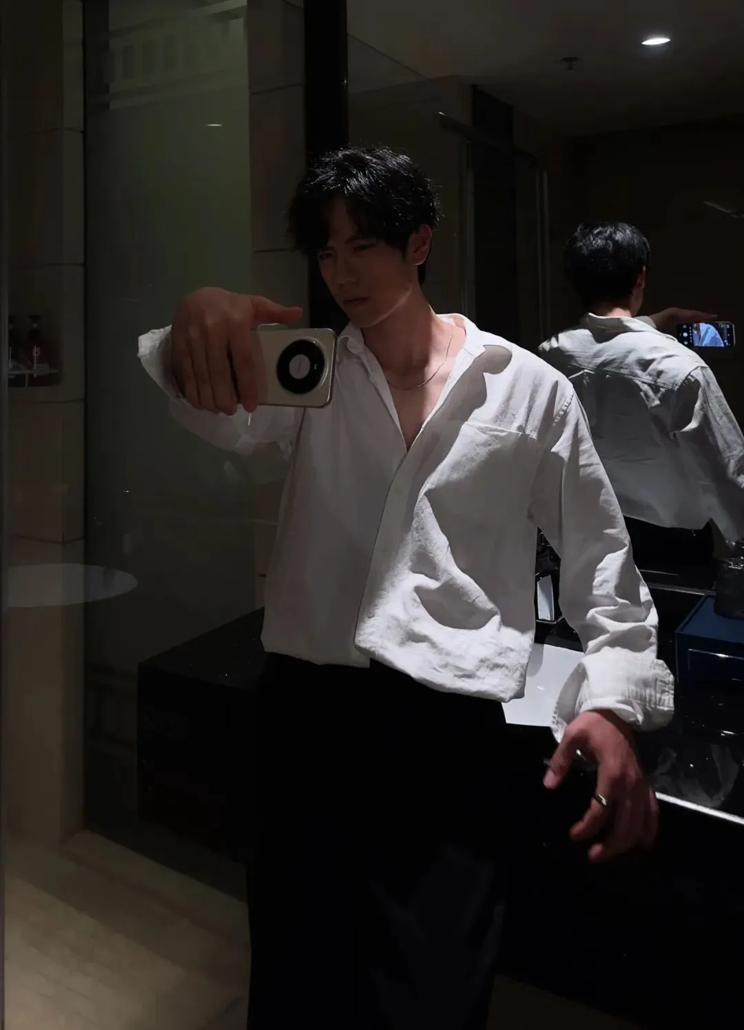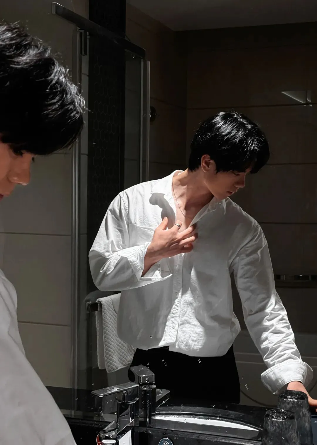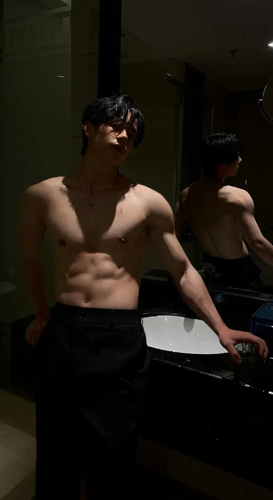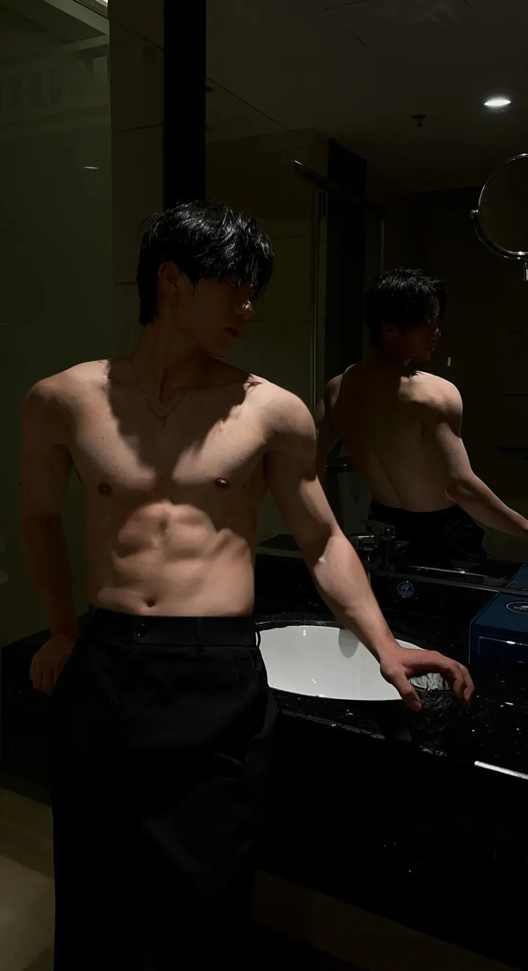 我们没有一上来就脱衣服。先从最放松的白衬衫场景过渡,让他慢慢适应镜头。等他状态松下来,我才带他到洗漱台 —— 这里的垂直射灯是天然的 "肌肉雕刻刀"。