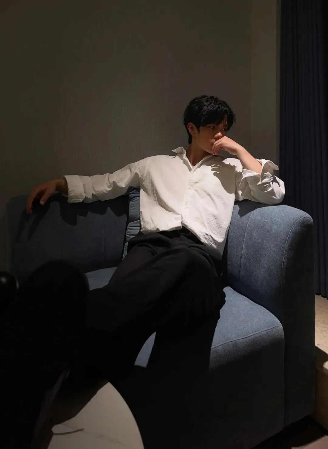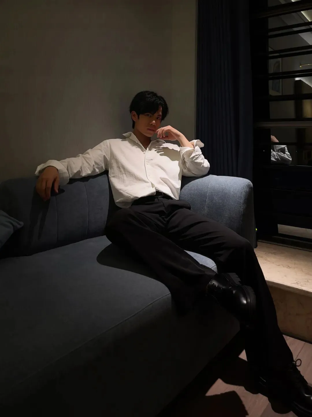 他靠在沙发上,腿漫不经心地搭在茶几上,暖黄色的侧光在冷灰色的墙上投下他的影子,那种生人勿近的 A 感,还有一点说不清道不明的疲惫和暧昧,一下子就出来了。我全程没有喊停,只是在他最自然的那个瞬间,按下快门。