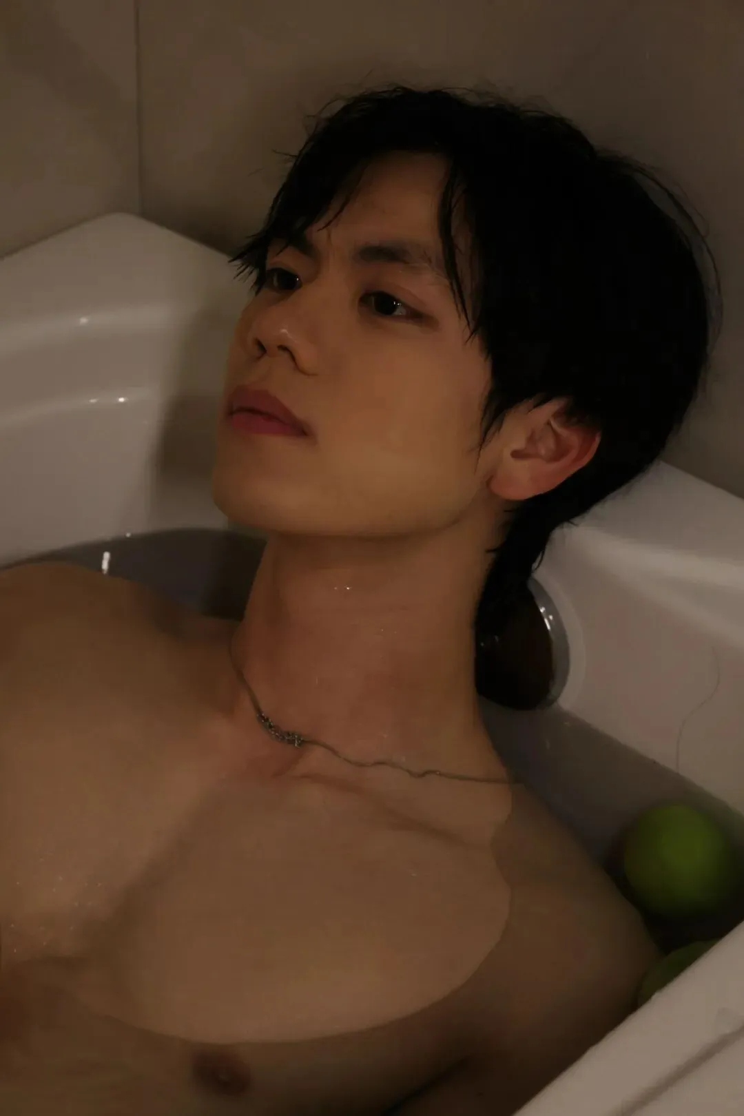 我没有开浴室的灯,只留客厅的灯光透过玻璃门透过来,形成柔和的漫反射。在浴缸里放了半缸水,让水面刚好没过他的胸口。