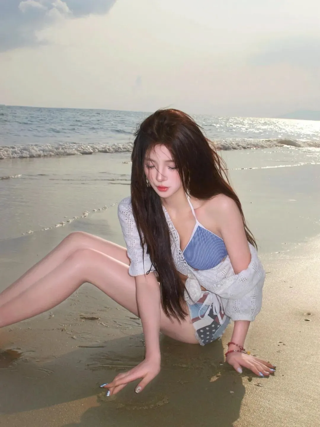 坐在湿沙边,身体侧一点,双腿向画面的一侧伸出去,腿要直一些但膝盖不要绷紧。一只手搭在背后,手指自然张开,另一只手轻轻放在沙面上,好像摸水边的细沙一样。头稍微低着点看地面或者海浪,并没有看向镜头更有故事感