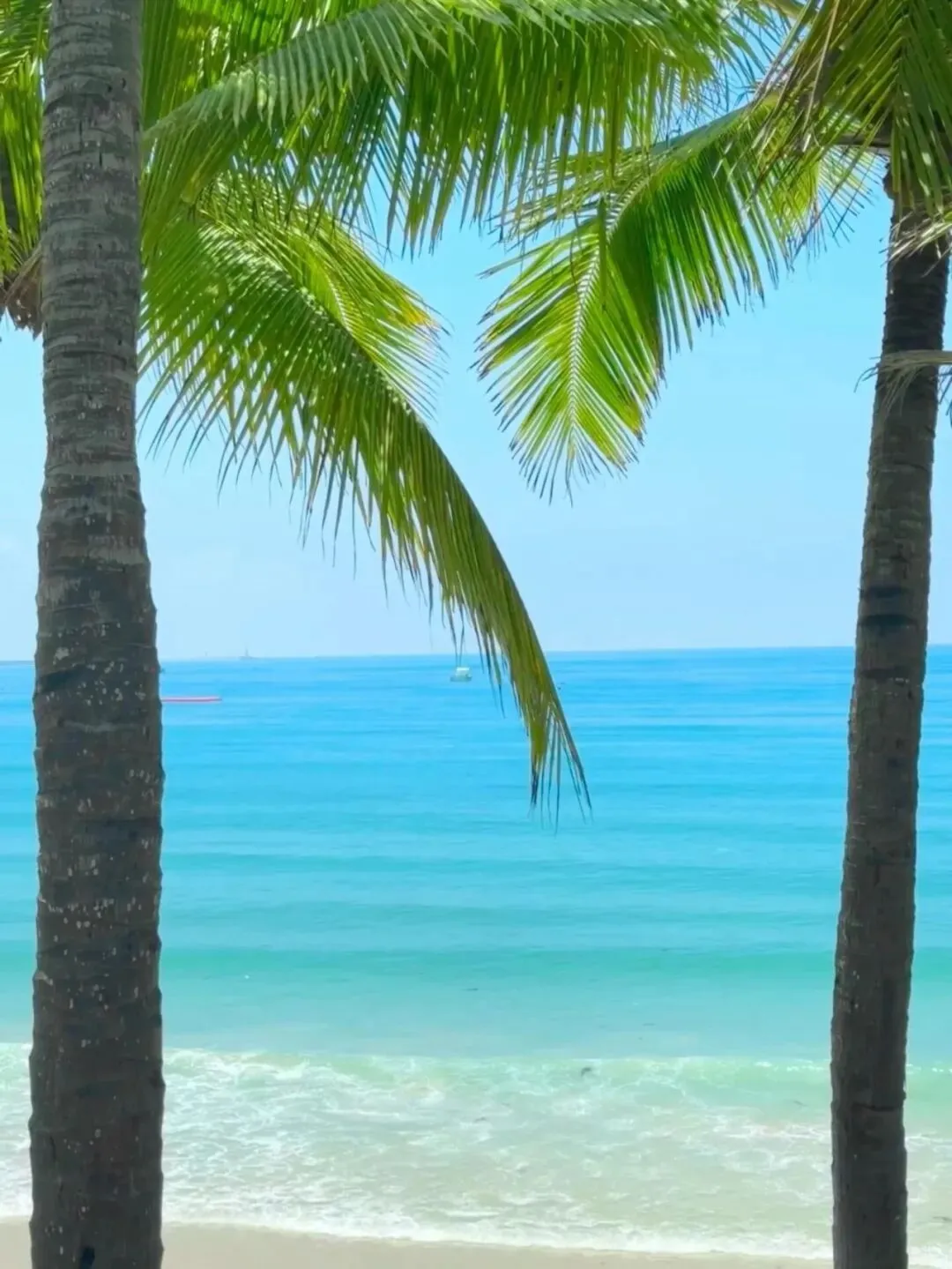 最后用一张纯粹的海景做结尾,画面中椰子树作为框景出现,海水很干净、透明度很好。拍的时候让树木分布在左右两边形成一个“门”,地平线保持水平的状态下拍摄的话,大海就会显得特别稳当了。人物不入镜也没有关系,这张照片的情绪是回落的。