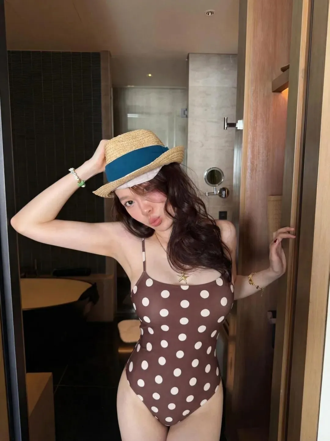 很多人去酒店房间拍照,最怕的不是镜头近,而是手不知道放哪,身体一站就僵,表情也容易用力过头,这组图其实很适合普通人照着拍,木质门框,暖色灯光,加上波点泳衣和草帽,天然就有一种轻轻松松的度假感,