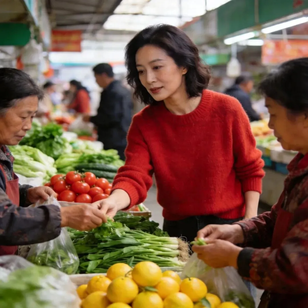 照片里,她穿着简单的红毛衣,在菜摊前挑菜。没有任何明星架子,就像一个普通的家庭主妇。