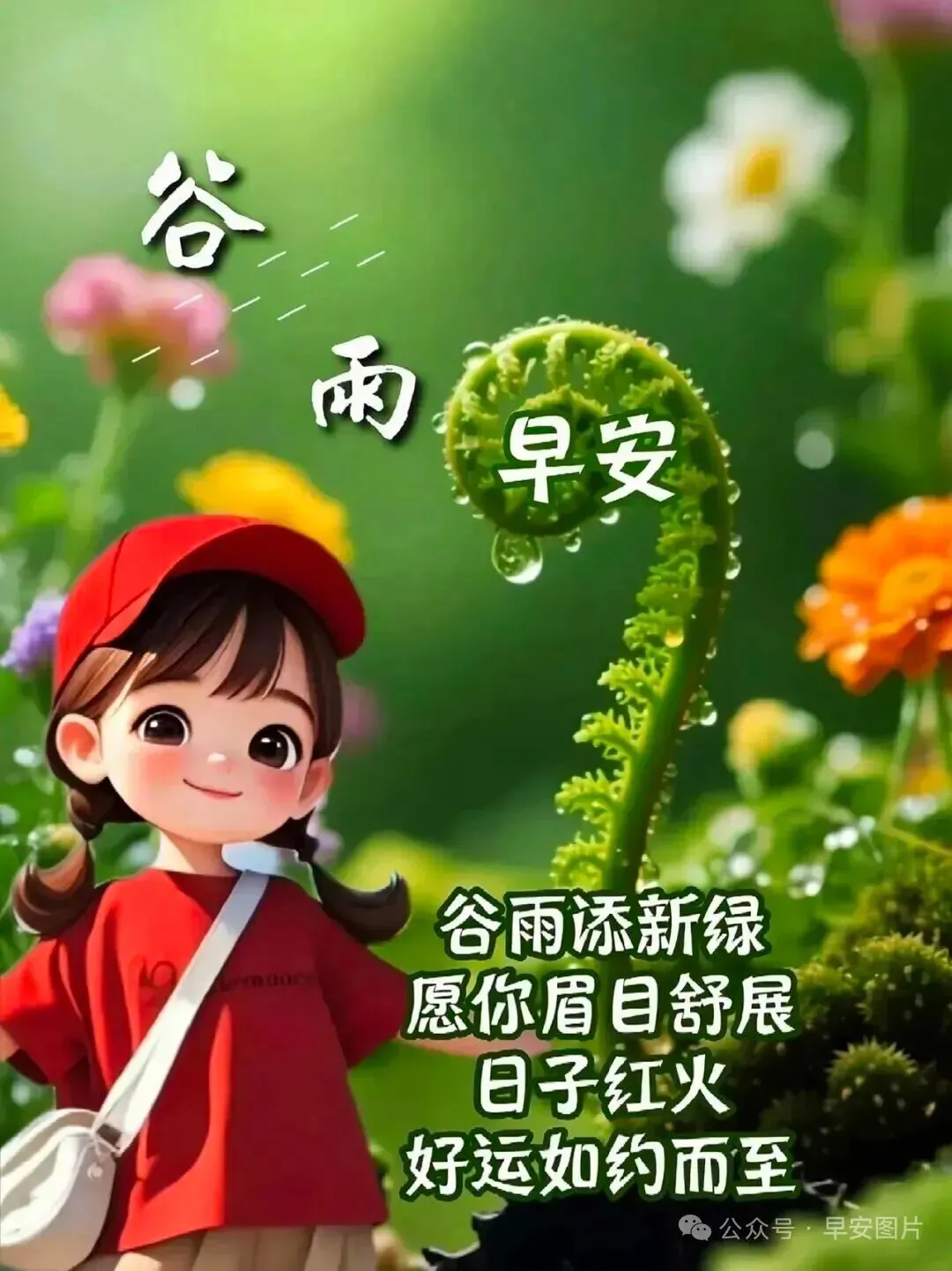 早安!新的一周🗓️,今日谷雨🌧️,雨落时清露凝枝💧。风拂田垄💨,麦穗开花🌾,新绿漫延🍃;雨润繁花🌧️,生机渐浓🌱。春日余温藏于点滴☀️,夏日清风踏光而来💨。万物润泽💧,人间安康。