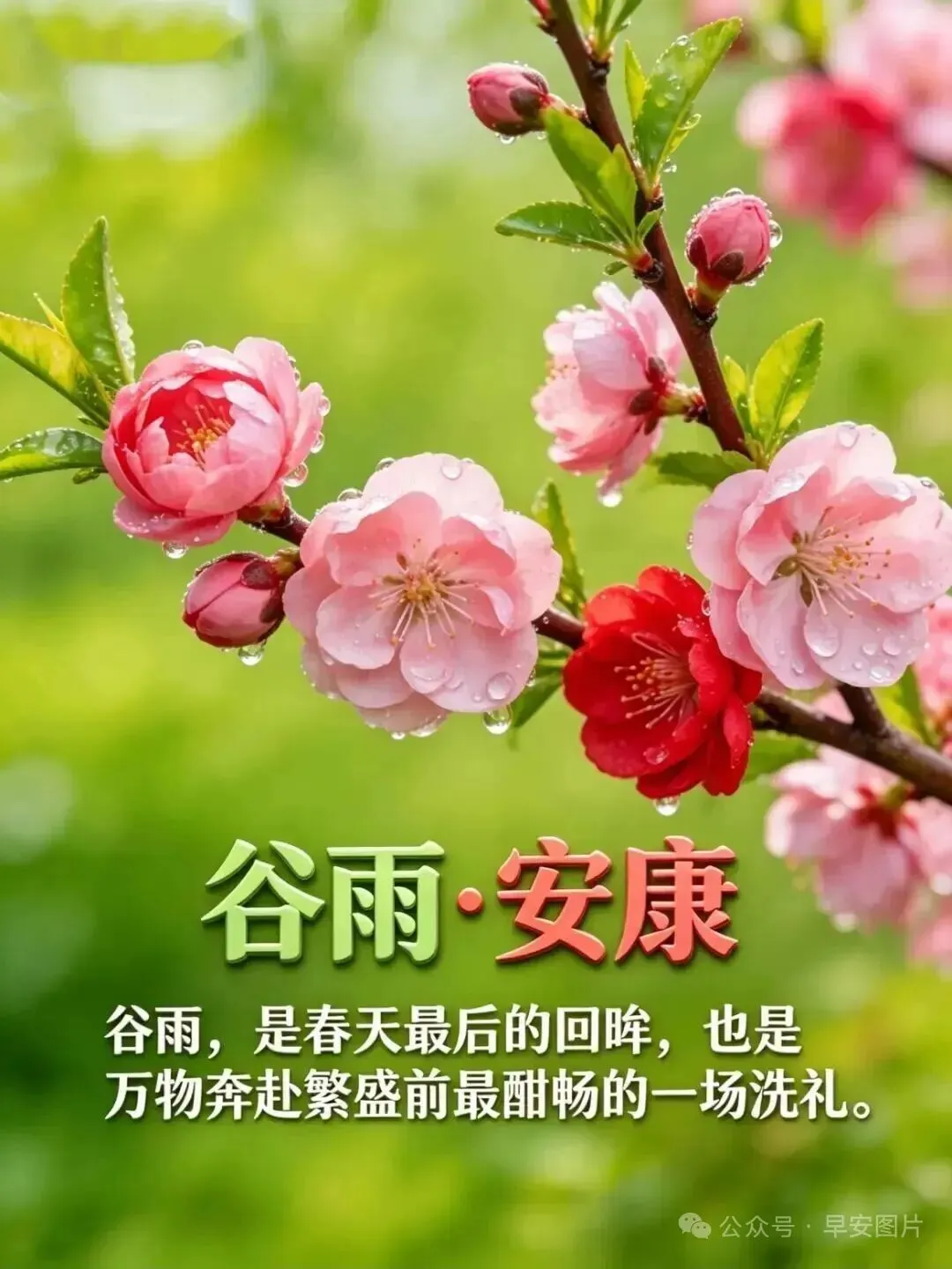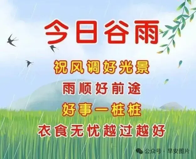 谷雨时节🌿,风轻日暖☀️;望望春柳🌳,闻闻花香🌸;让生活添彩🌈,让时光留香🌷,新的一天🌞,送上我真挚的问候💌:平安🍎、健康💪、快乐😁、吉祥🧧!谷雨早安!🌹