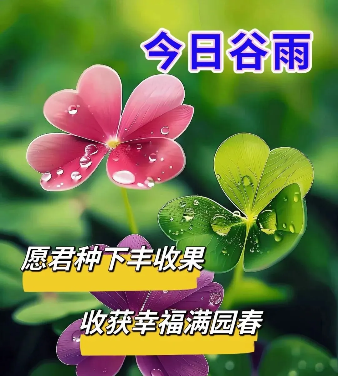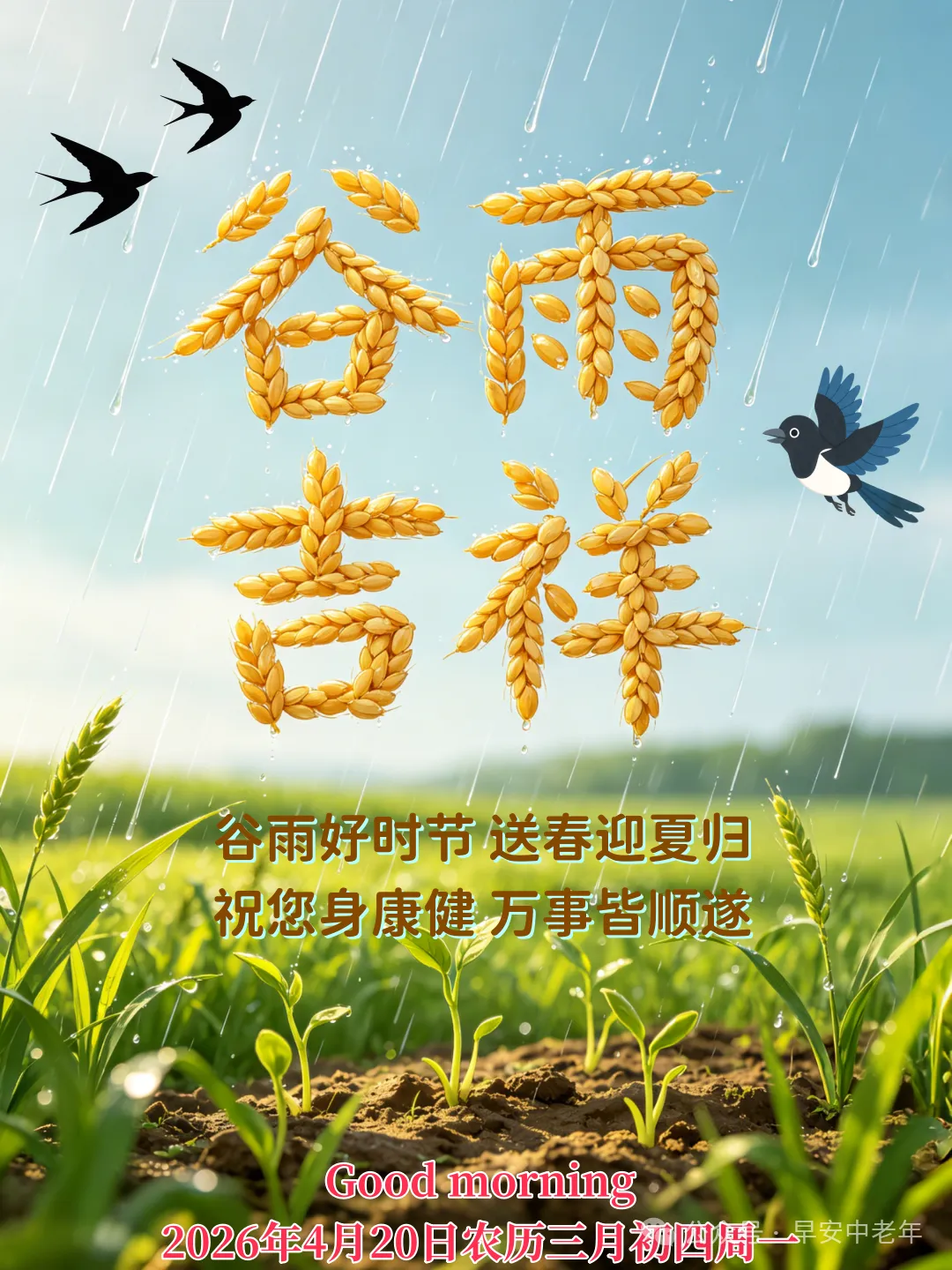 2026年4月20日谷雨早安祝福图片,好雨生百谷,好友送祝福.催开幸福花,催熟丰收谷.谷雨节气快乐!