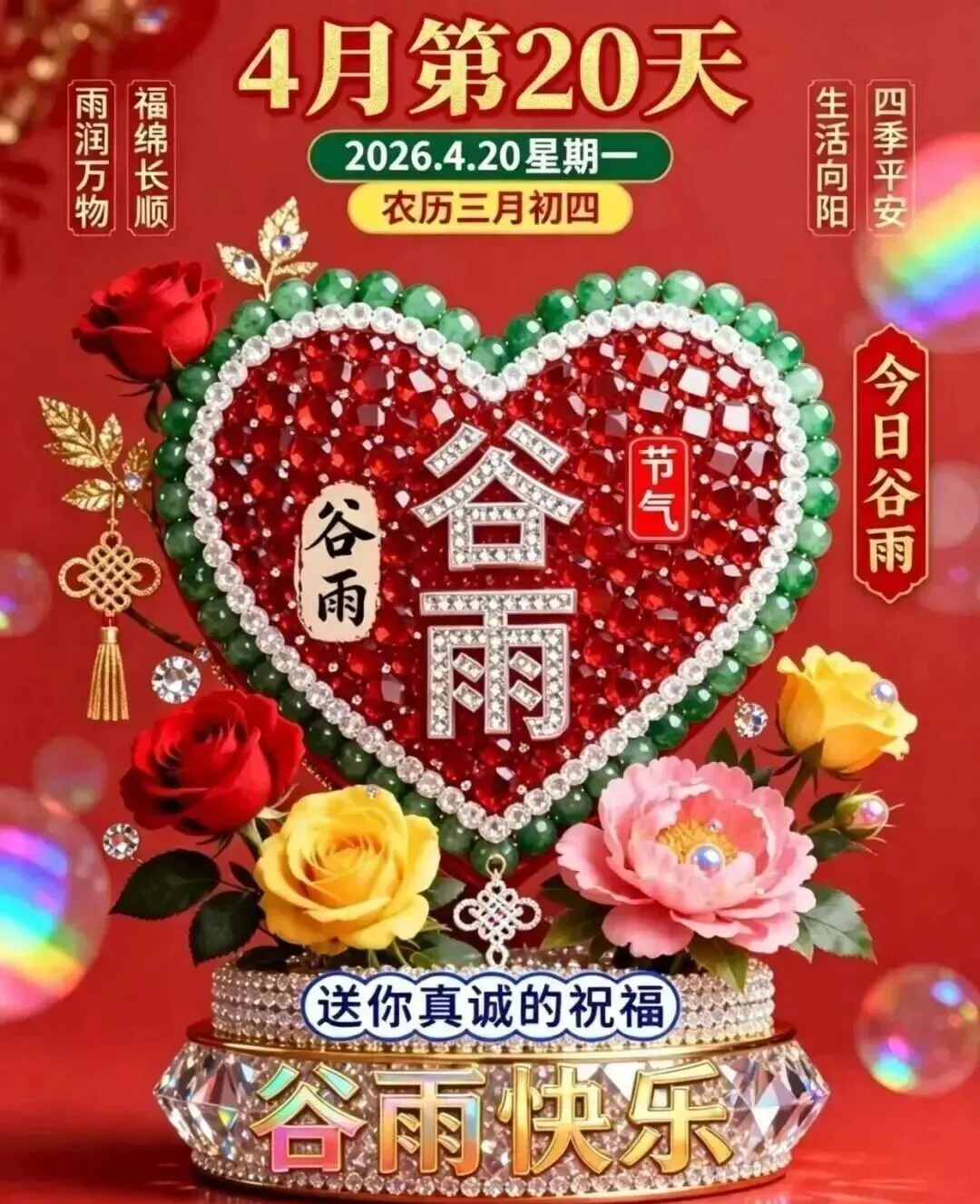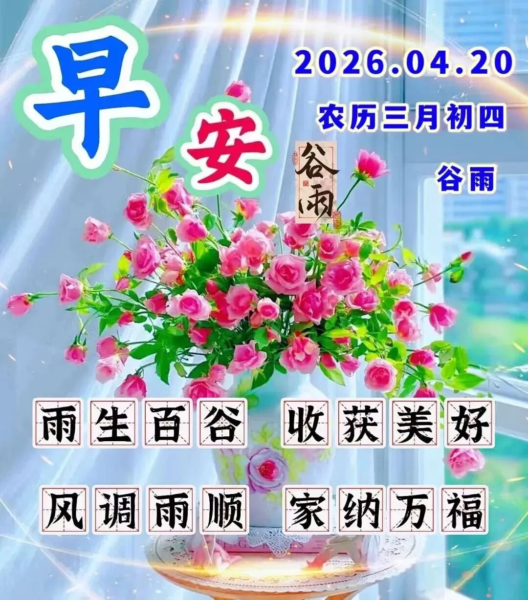 当前位置:首页>美女资讯>2026年4月20日谷雨早安祝福图片,好雨生百谷,好友送祝福.催开幸福花,催熟丰收谷.谷雨节气快乐!