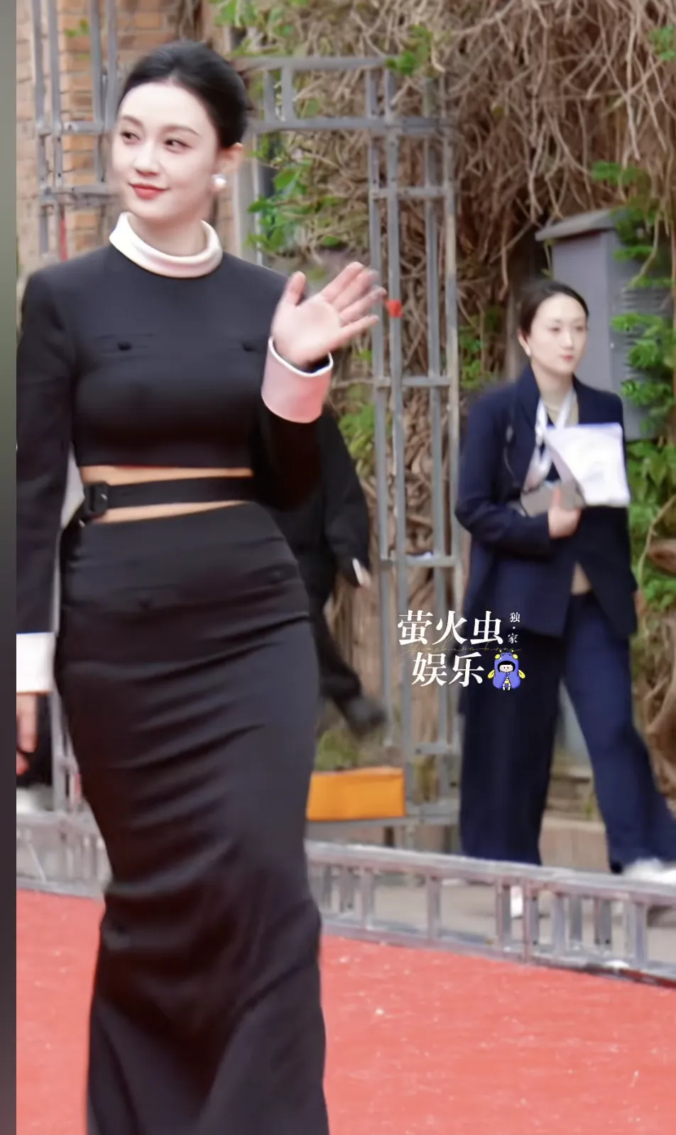 当天她穿了一套黑色的修身礼服,短款上衣配长裙,按理说这种款式是最显身材的,能把妙曼曲线勾勒。