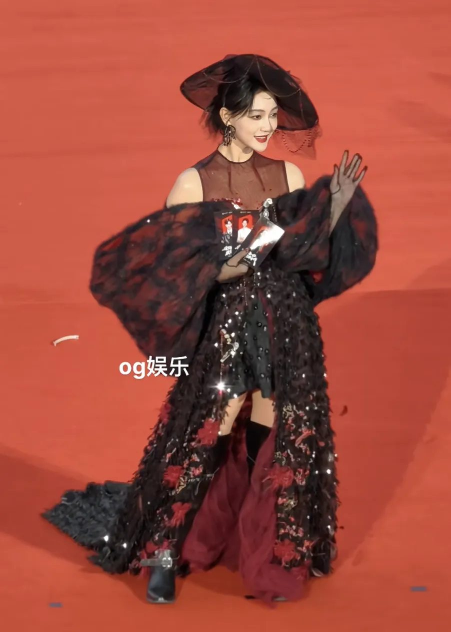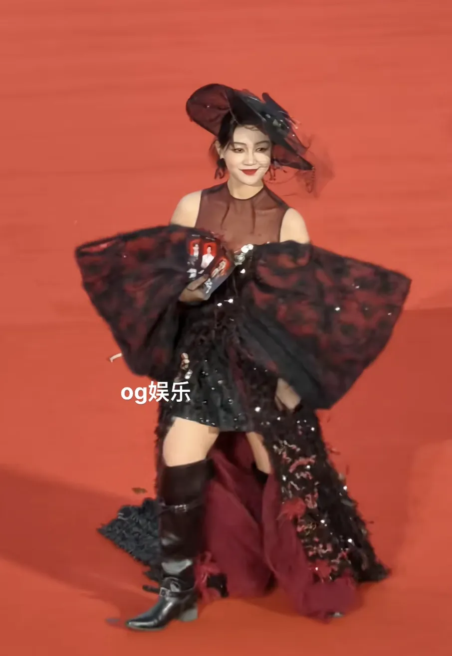一身暗沉的黑色穿搭,靴子帽子大袖摆,整体又笨重又压抑,完全没凸显出她的美貌,反而显得老气横秋,和现场其他女星比起来,差距一下子就拉开了。