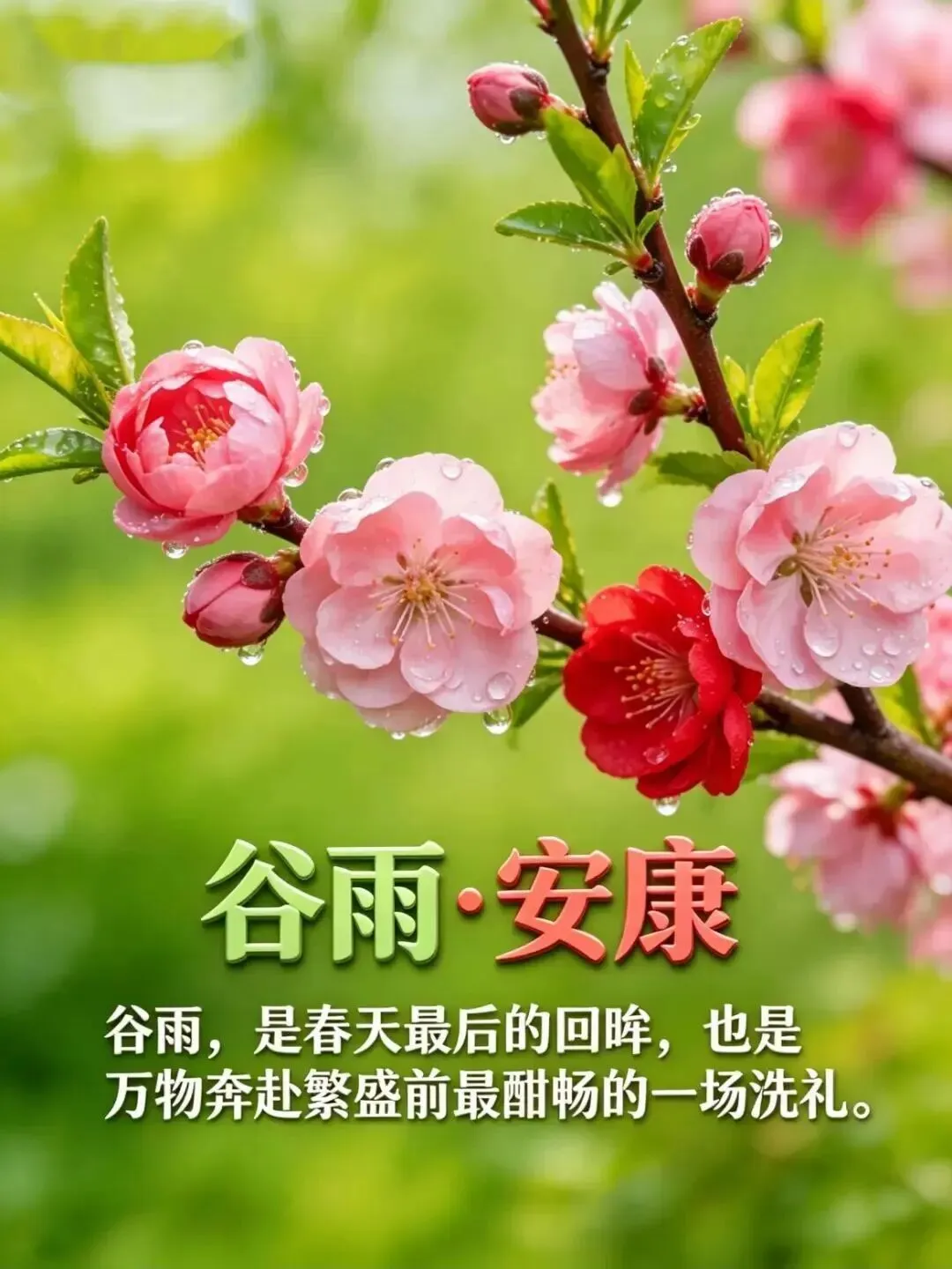 谷雨时节雨润万物🌱,春意渐浓☔️;愿您晨起安康☀️,心情舒畅😊,饮食清淡🥗,多加保暖🧣,身体硬朗💪,笑口常开😁,平安顺遂✨,福寿绵长🎋,谷雨早安!🌿