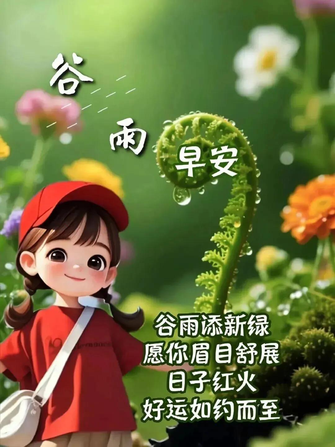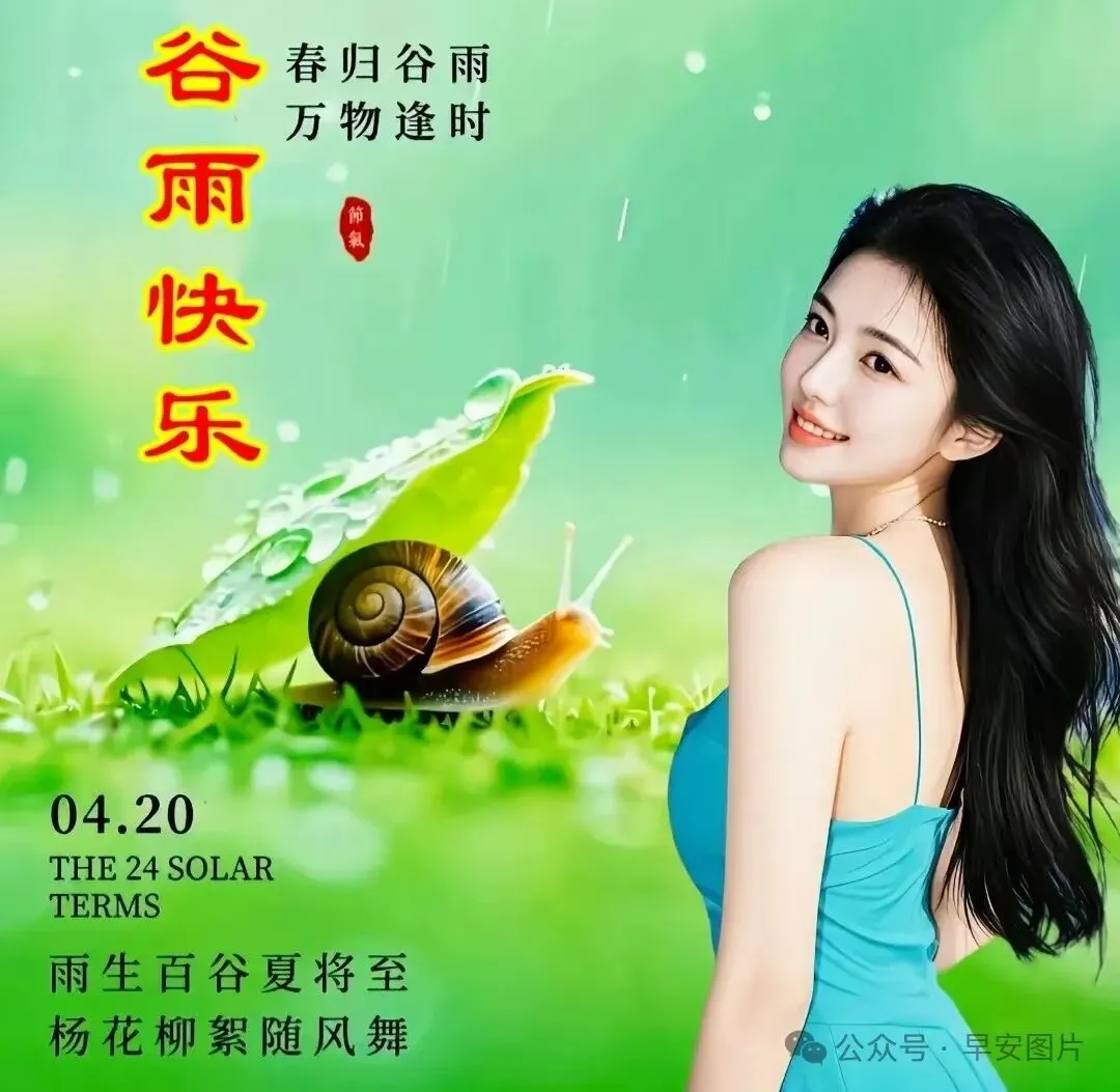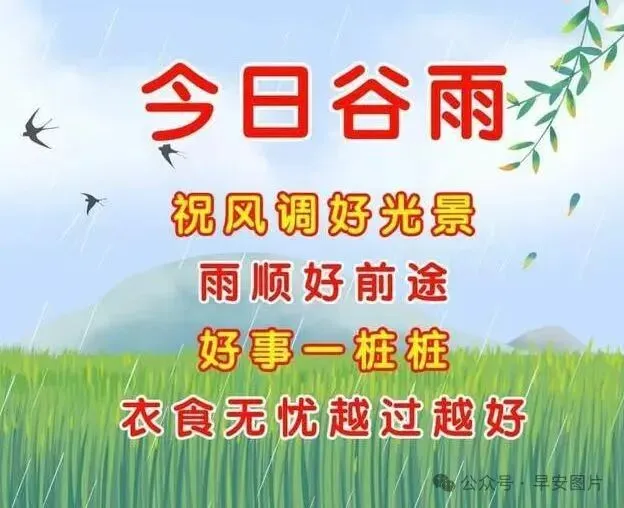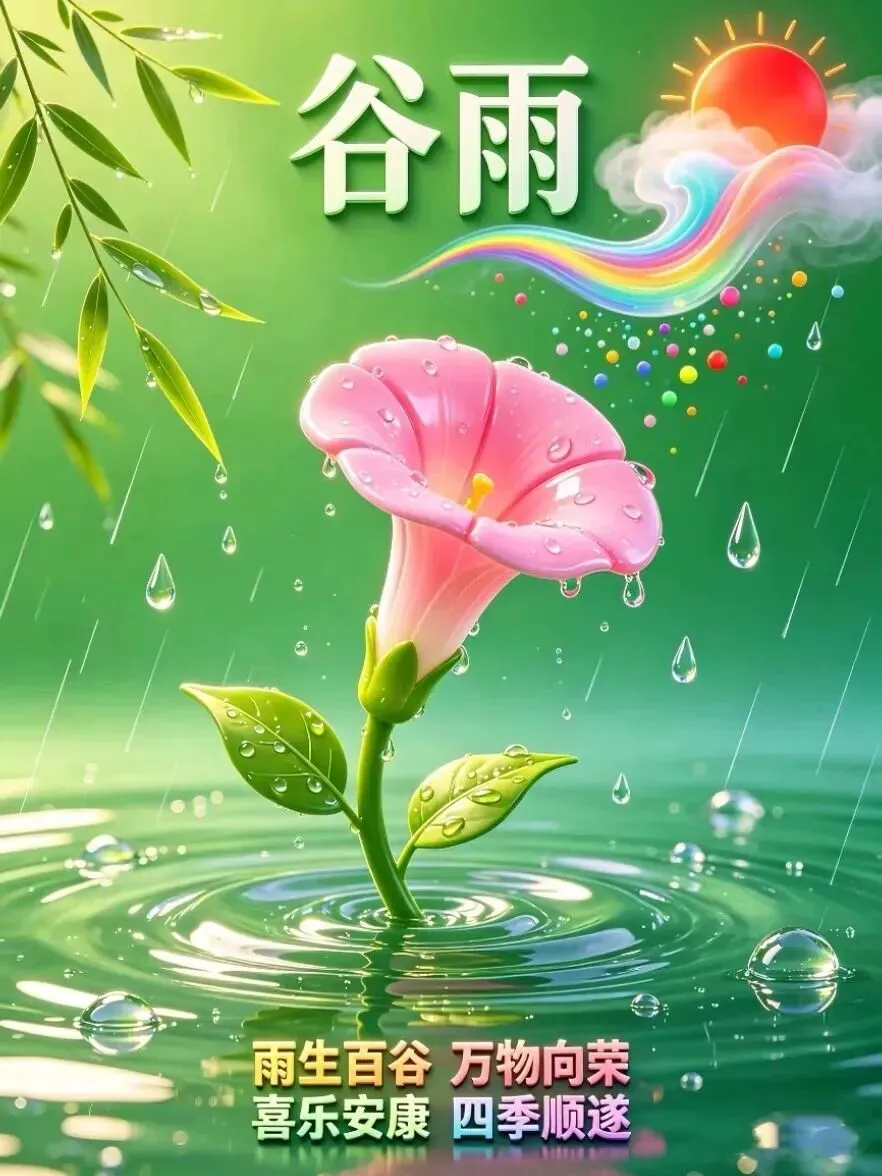 早安!新的一周🗓️,今日谷雨🌧️,雨落时清露凝枝💧。风拂田垄💨,麦穗开花🌾,新绿漫延🍃;雨润繁花🌧️,生机渐浓🌱。春日余温藏于点滴☀️,夏日清风踏光而来💨。万物润泽💧,人间安康。