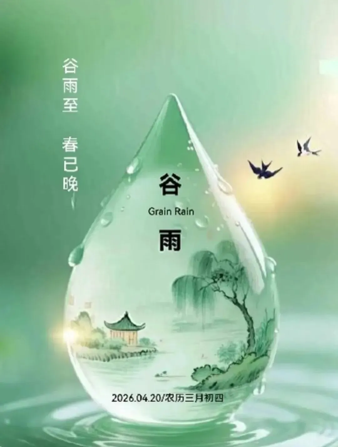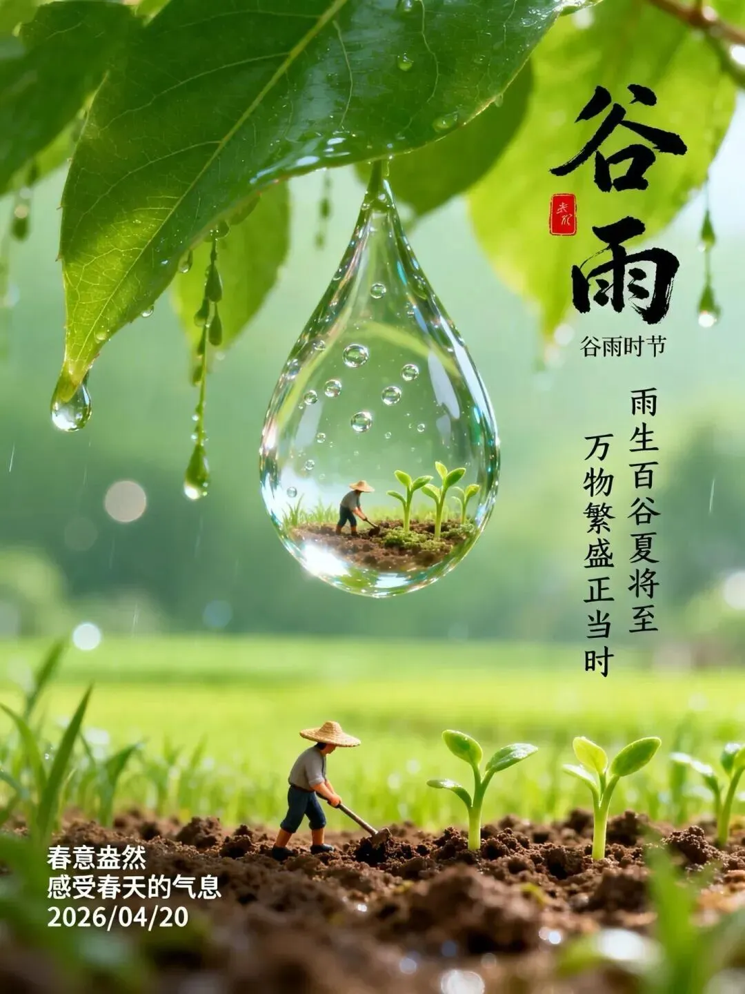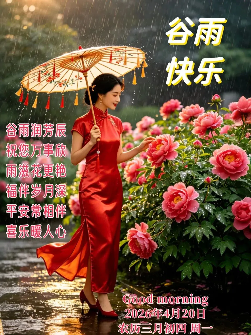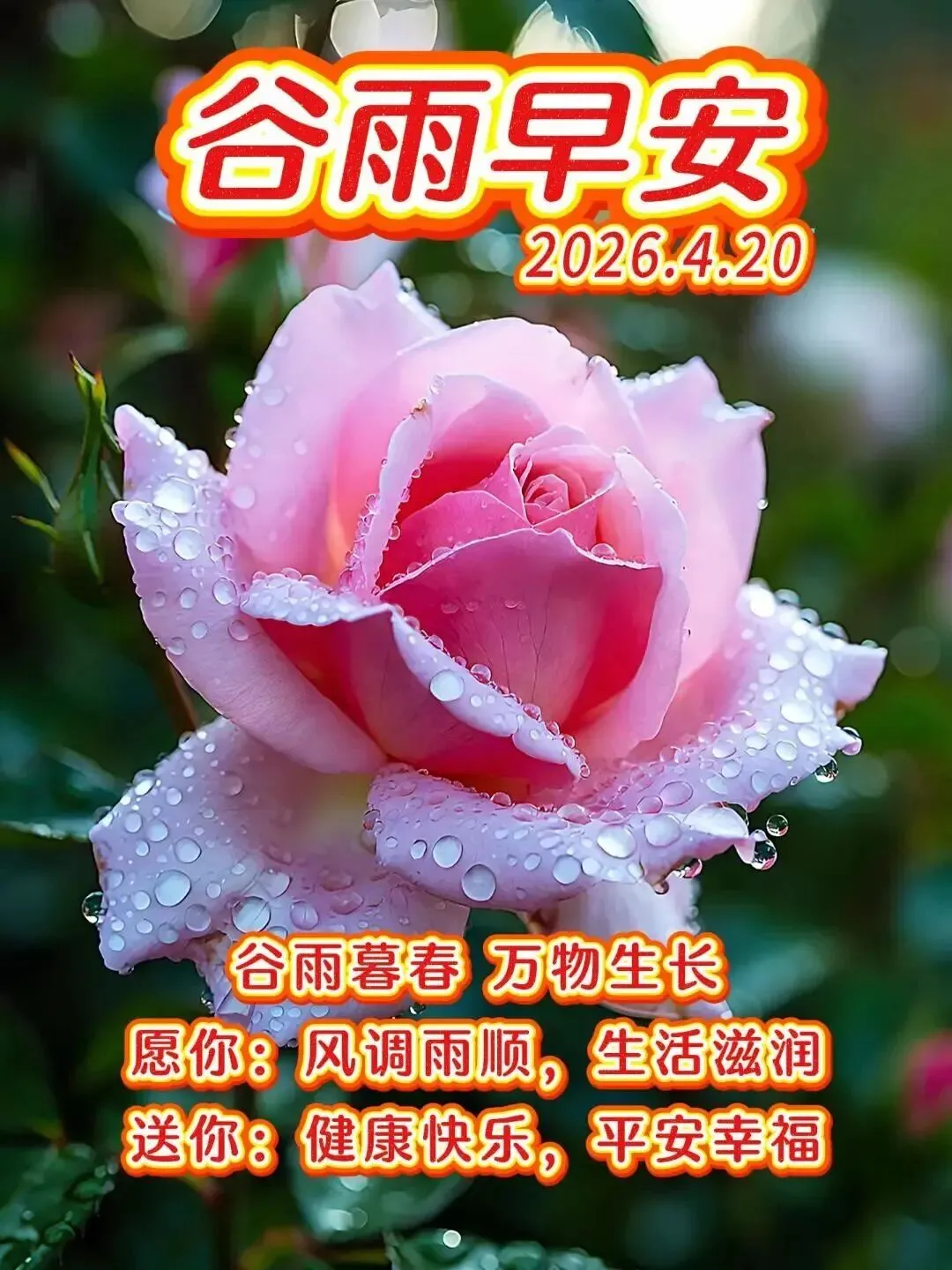 2026年4月20日谷雨早安图片,好雨生百谷,好友送祝福.催开幸福花,催熟丰收谷.谷雨节气快乐!
