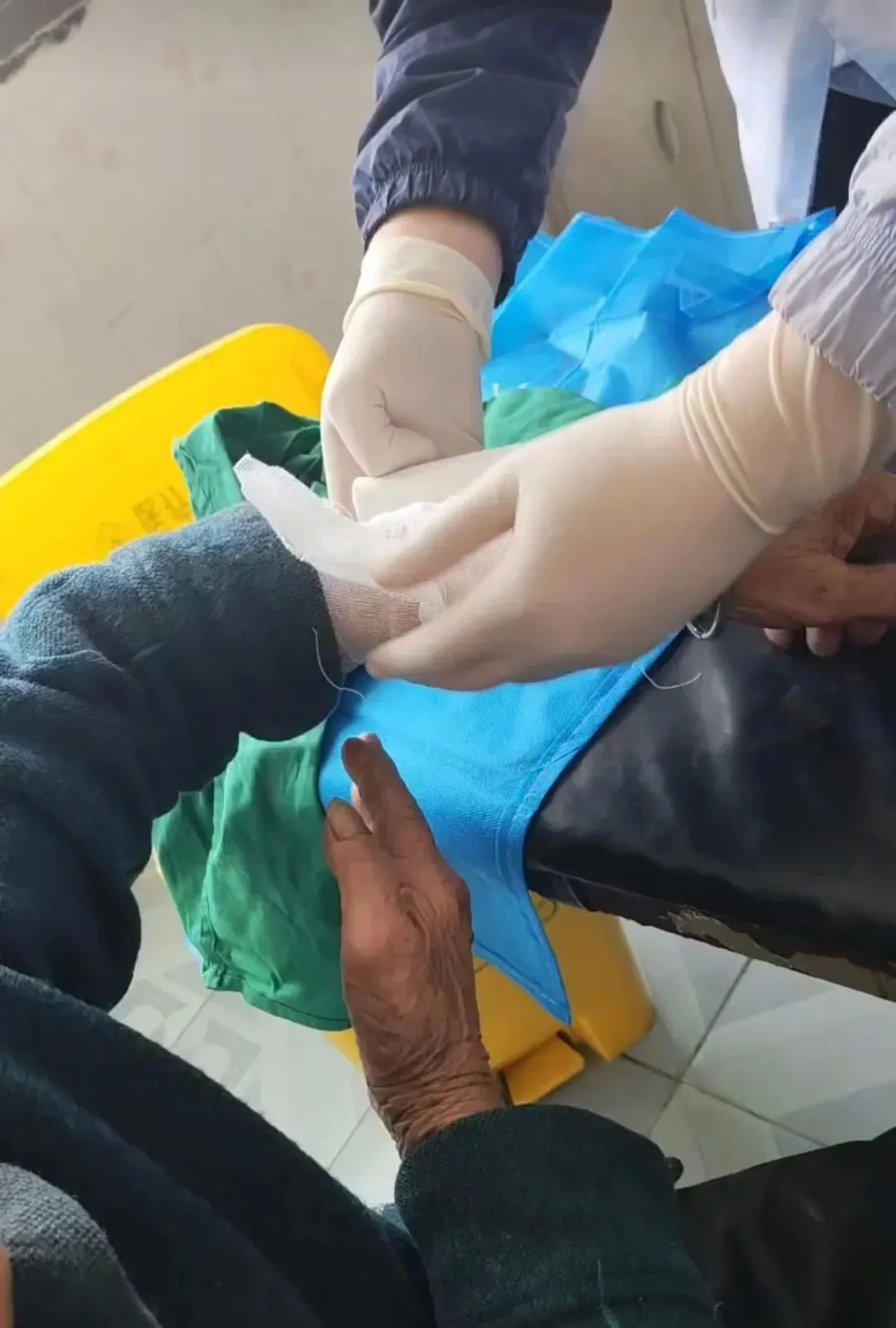 居住在罗桥镇罗市村罗家湾龚中德母亲——罗梅容,是一位八十多岁的老奶奶。因为年龄大了,经常想念老家,要回老家板桥镇干沙港村何家组住几天,只要我知道她回家了,基本上我都会隔个一两天回去给她以及其它两位八十多岁的留守老人挑水、洗衣、做饭,坚持很多年了。在2025年4月13日上午赶完集,我把饭菜做好,用打包盒装好,再带了些水果骑摩托车回老家,去给她送米油、水果和饭菜,到她家门口的时候,没见到她。后来发现她躺在床上,有气无力的样子,我就觉得今天她老人家有点不对劲,靠近床边发现她盖的被子有血迹,当时吓了我一跳。看见她眼睛肿肿的,脸上还有大块的伤痕血印,又看到她的手和脚,还有身上都有深深的伤和血痕。原来老人家眼睛视力不好走路没看清,在山上采摘茶叶时候站立不稳摔伤了。老人家说,当时不知道咋的眼睛发黑,昏过去了,也不知道啥时候醒过来的,跌跌撞撞到天黑才迷迷糊糊走到家。我二话没说就拨打了罗桥镇人民医院的救助电话,但她老人家还是那句话怕花钱,不肯去医院。但我坚决不同意,老人伤口深又灌脓,若不及时去处理伤口,很可能引起感染发炎,随时都会有生命危险。在我的再三坚持下,我们到了医院,我扶着她老人家找医生检查身体,经过拍片发现她的伤势太严重,伤口几处都太深,头、脚、胸口全是伤。直至老人脱离危险之后,我才离开医院病返回自己家中。