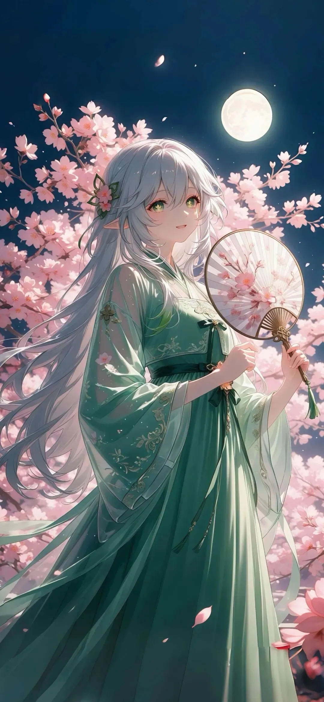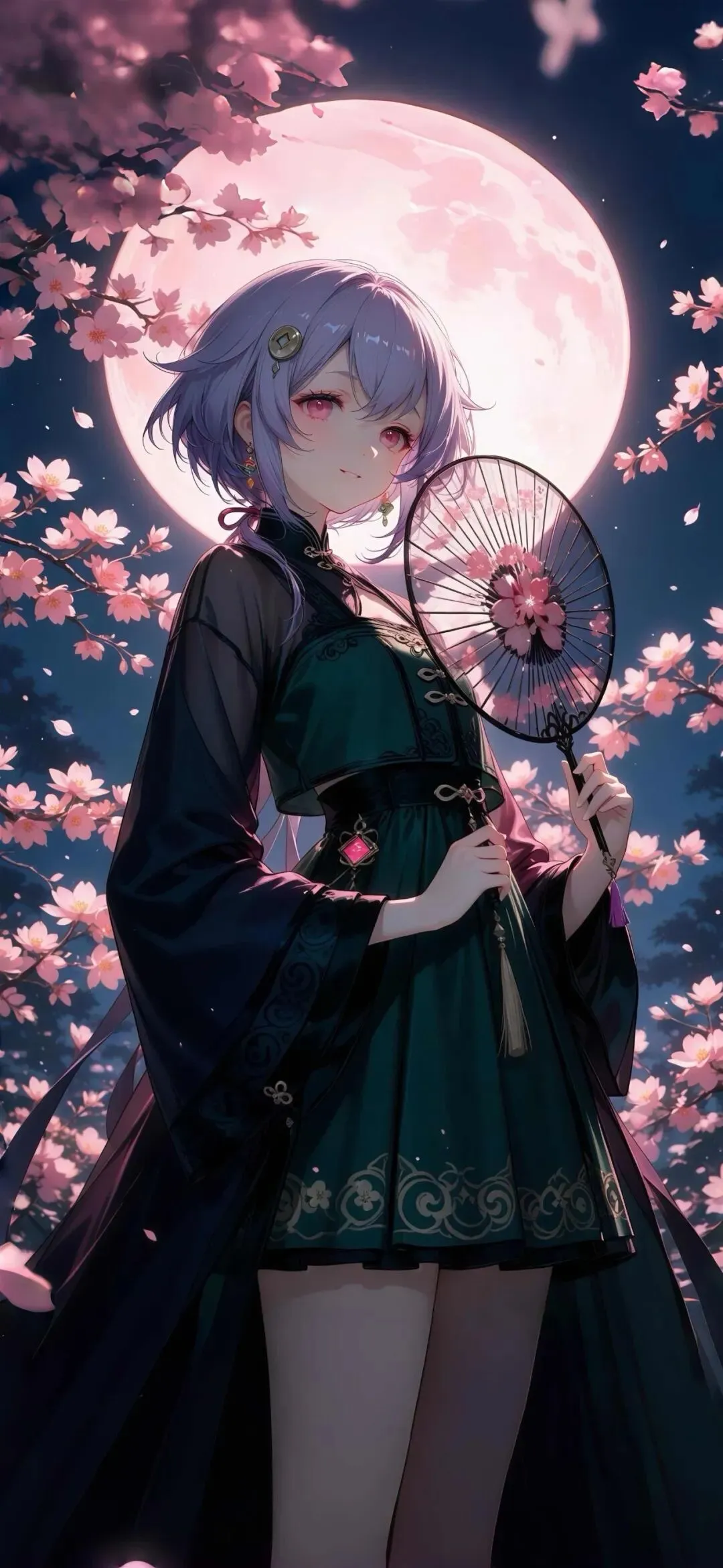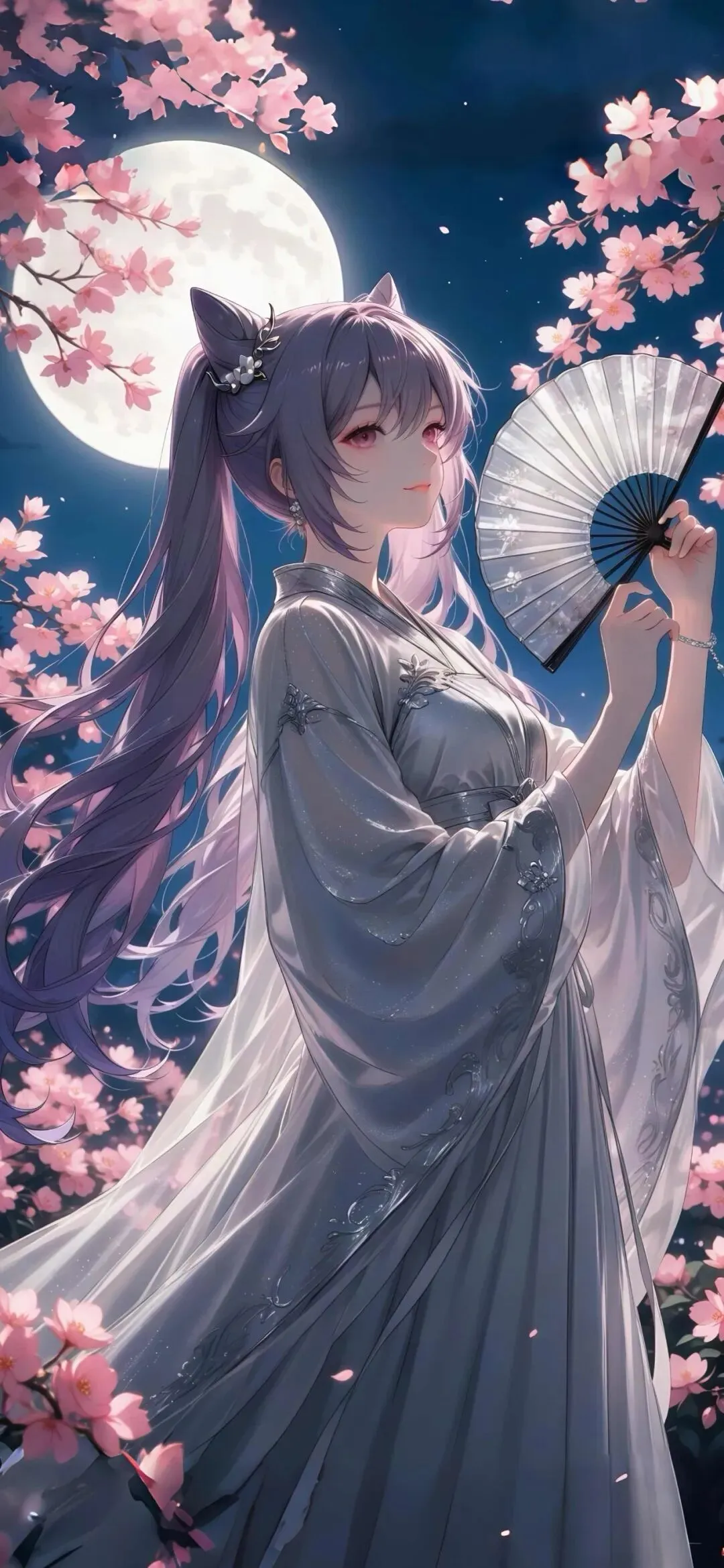 浅紫短发的七七清冷又软萌,铜钱发饰辨识度十足。新中式裙装搭配细腻暗纹刺绣,黑纱广袖朦胧雅致,樱花团扇温柔点睛。藏青夜空衬着柔粉满月,樱花枝桠交错环绕,片片花瓣悠然飘落,月色繁花相映,静谧又唯美,古风氛围感直接拉满。刻晴紫渐变双马尾搭配精致猫耳,清冷气质格外亮眼。细闪古风汉服仙气飘逸,流云刺绣精巧别致,轻纱广袖灵动舒展。执折扇立于烂漫樱林,深蓝夜幕挂起皎皎圆月,落樱随风漫舞,冷艳与温柔相融,国风意境唯美又独特。纳西妲银发配精灵耳纯真灵动,碧色眼眸干净澄澈,樱花发饰精巧可爱。豆绿薄纱长裙轻盈柔和,纹样雅致,桃花团扇清新温婉。静夜皓月清辉洒落,层层樱花簇拥纷飞,光影温柔朦胧,画风治愈仙气,尽显柔和浪漫的春日国风美感。