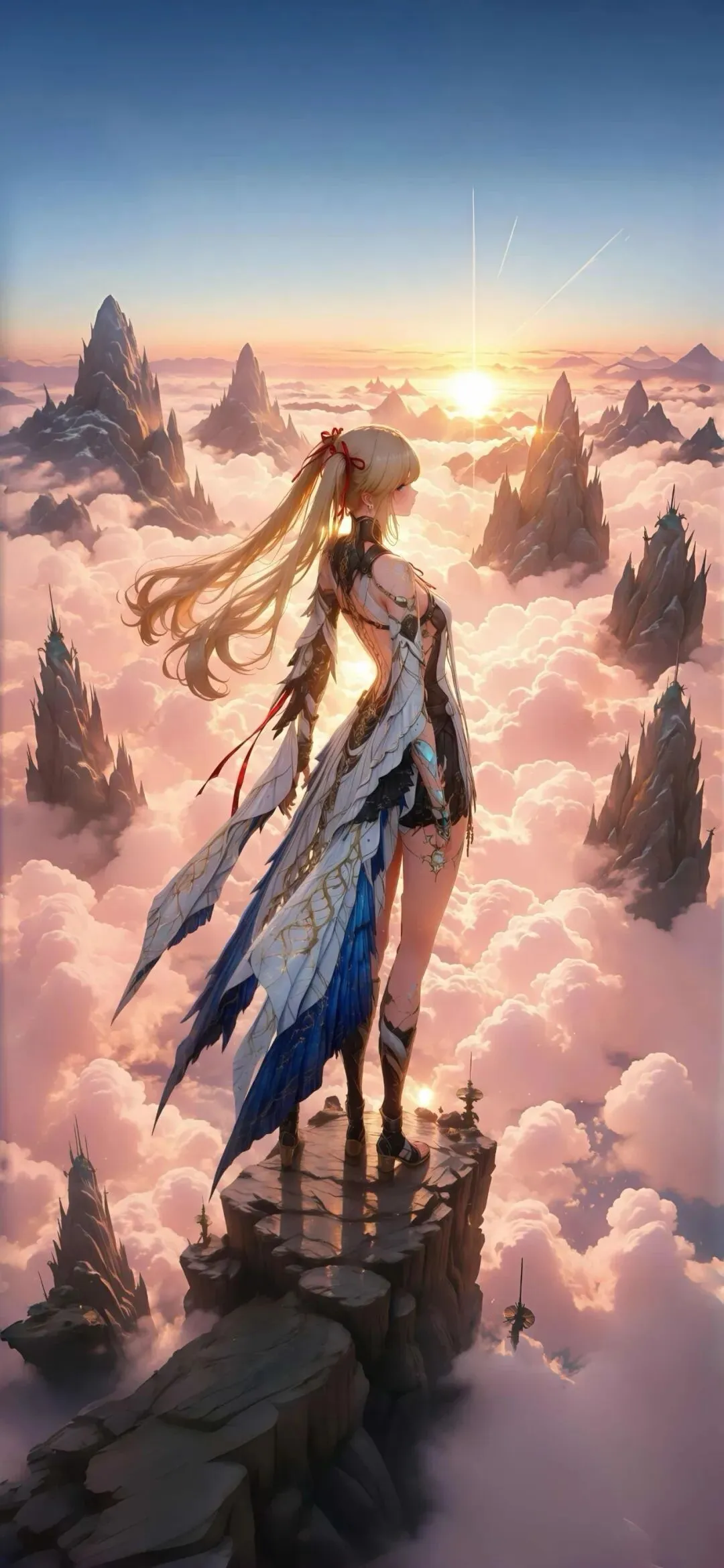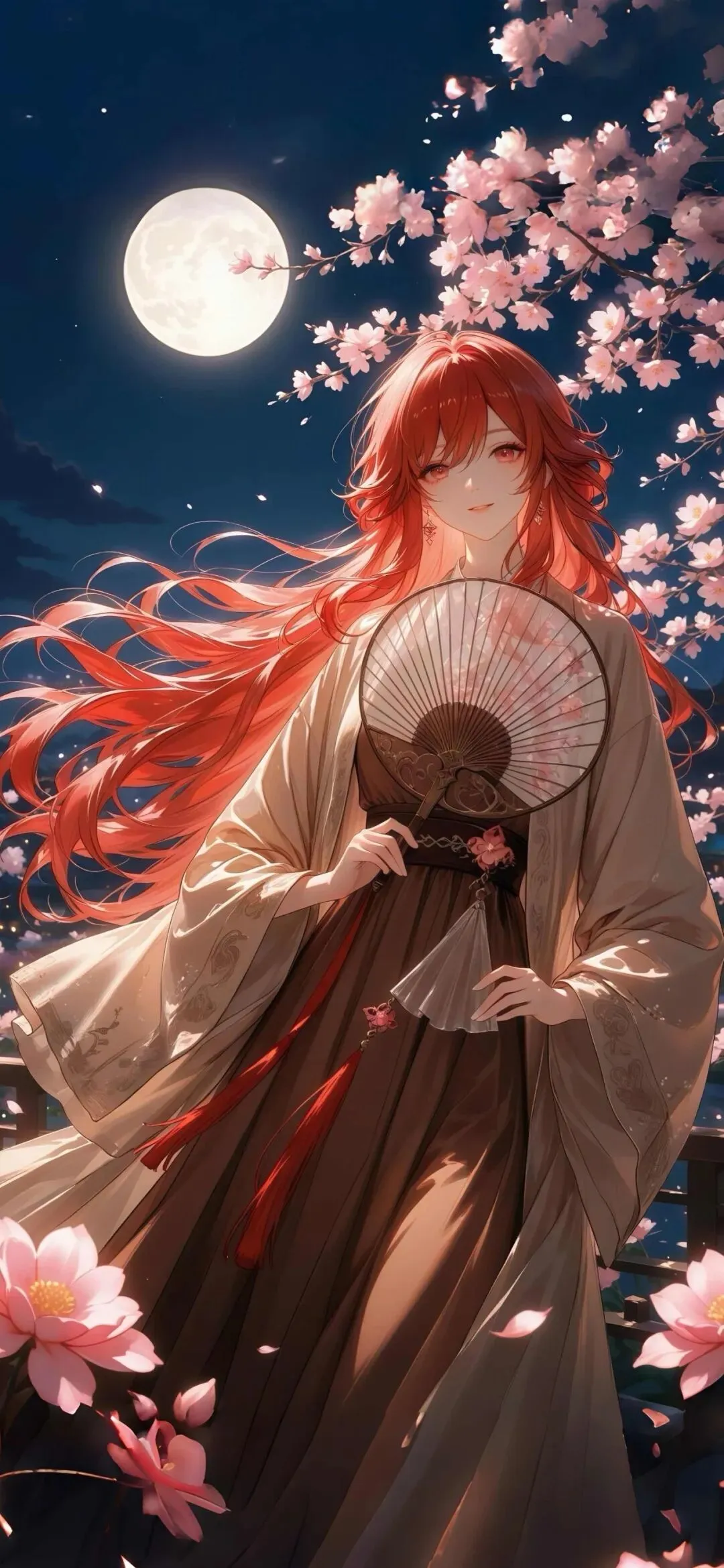 红发少女气质温婉动人,酒红长发随风轻扬,眉眼温柔缱绻。古风长裙搭配轻薄广袖外衫,古韵雅致,手持团扇更添柔情。满月高悬,夜色静谧,漫山樱花烂漫盛放,莲花悄然绽放在花丛中,落樱轻舞,月色与花海交织,勾勒出温柔唯美的古风意境。雷电将军气质清冷绝尘,暗紫长发温婉大气,发饰精致典雅。纯黑和服质感高级,暗纹细腻华丽,手持樱花团扇尽显和风韵味。皓月当空,落樱纷飞,古朴建筑搭配点点灯火,夜色静谧悠远,冷冽气质与柔美夜景相互融合,氛围感清冷又梦幻。旅行者荧英气十足,浅金高马尾利落清爽,红丝带点缀灵动别致。战风服饰设计精致飒爽,裙摆飘逸灵动,气场十足。独立立于云海悬崖之上,奇峰环绕,云海翻涌,破晓晨光冲破云层,漫天霞光铺洒山河,辽阔景致壮阔治愈,尽显潇洒自由的少年意气。