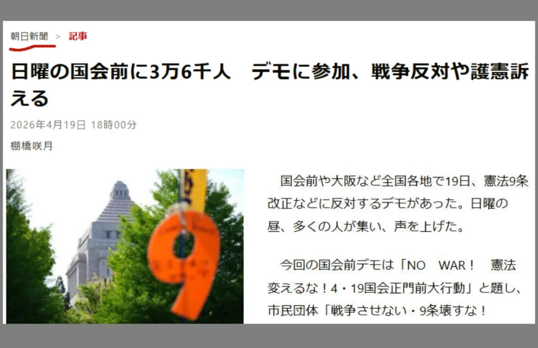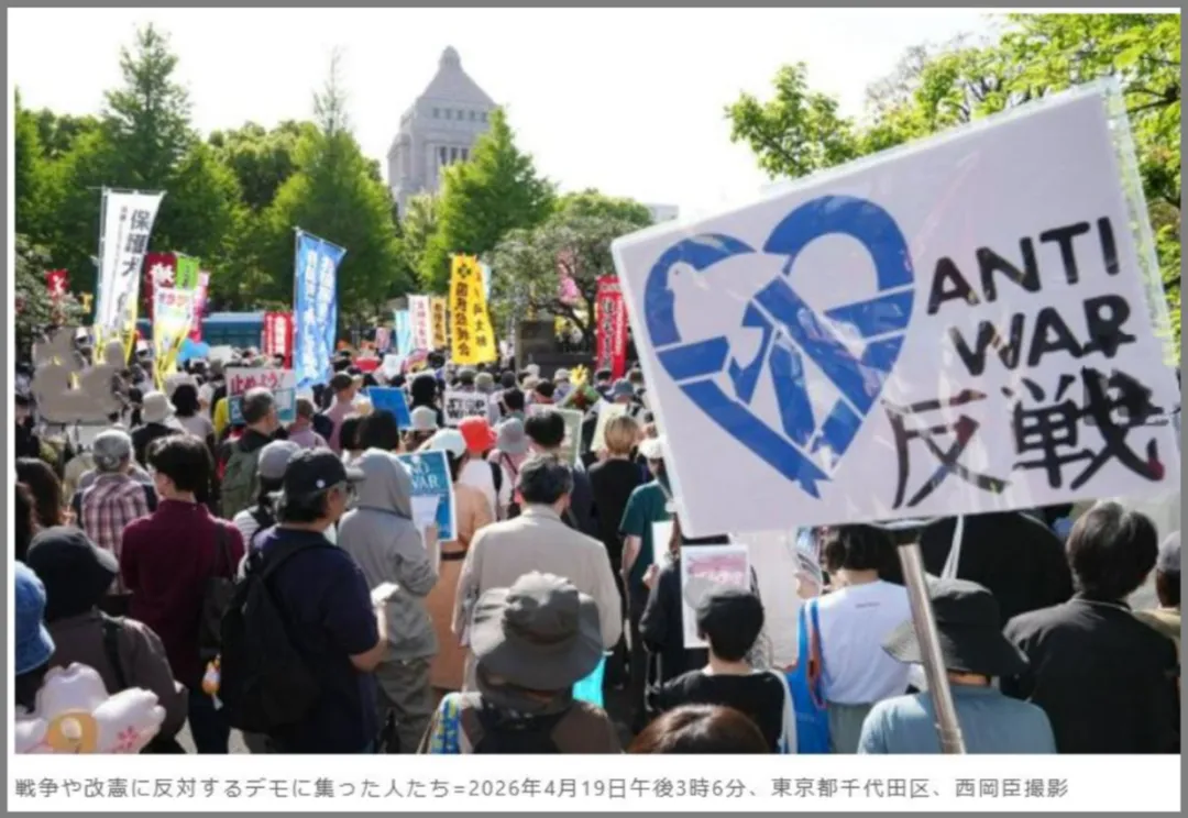 日媒现场图片新闻报道,昨天周日(4月19日),在东京国会前及大阪等全国各地,再次爆发了反对战争、反对修宪的示威游行。周日午后,众多民众(有约36000人)聚集一堂,高声表达诉求。