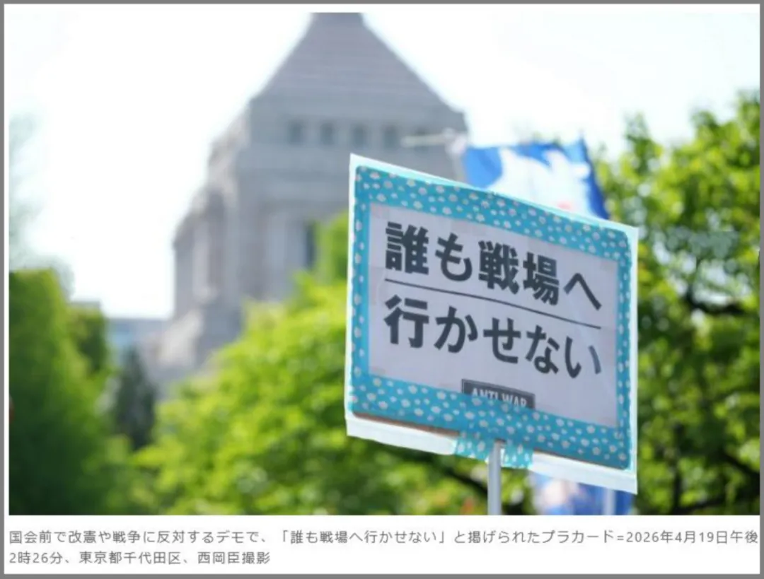 ↑2026年4月19日下午2时26分,东京都千代田区,在国会前反对修宪及战争的游行示威中,民众高举写有“绝不让任何人奔赴战场”的标语牌。西冈臣 摄